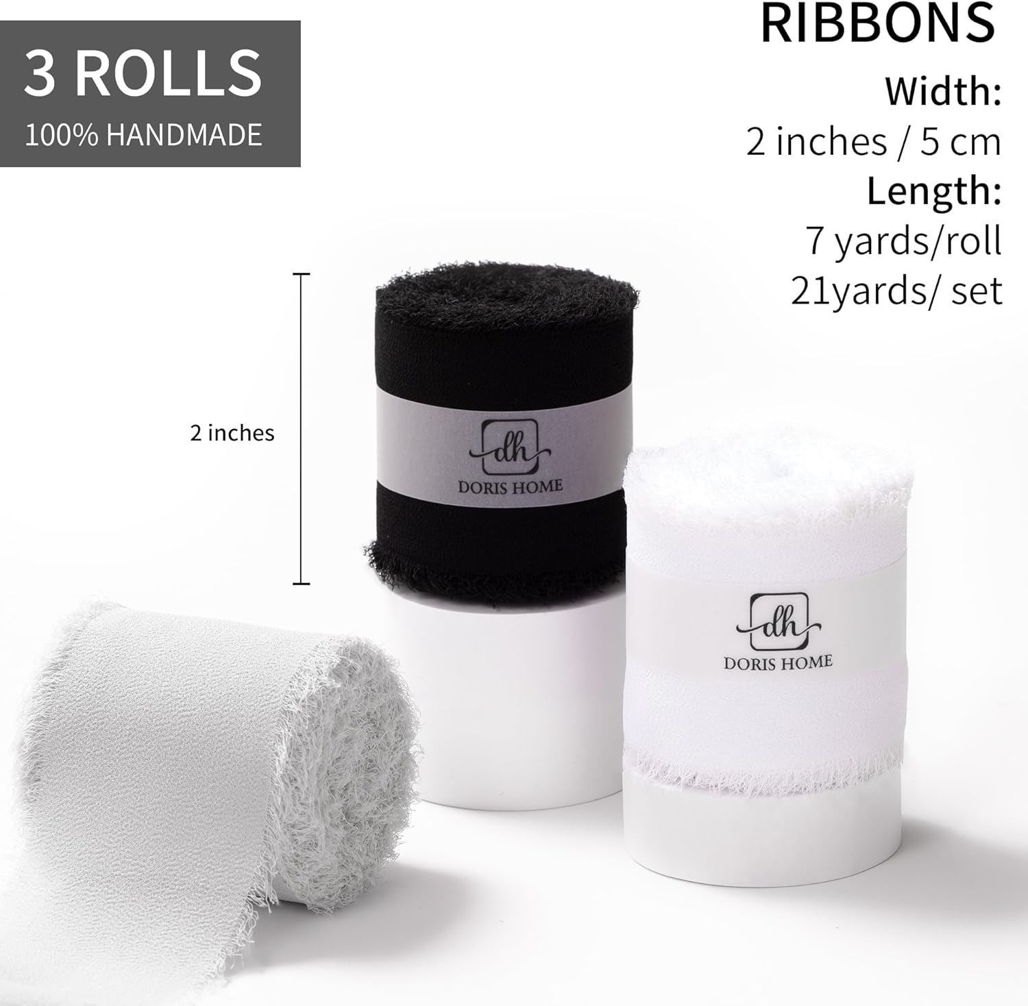 - 【Size and Color】Each roll of chiffon ribbon is 2 inches wide and 7 yards long, perfect for various creative uses such as making bows, decorating wreaths, and DIY crafts. This set includes black, white, and light grey ribbons, one roll each. These vibrant frayed ribbons add a rustic charm to your creations, ideal for bouquet wrap or gift ribbon.