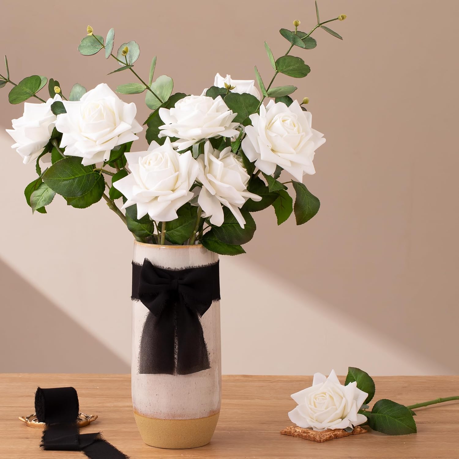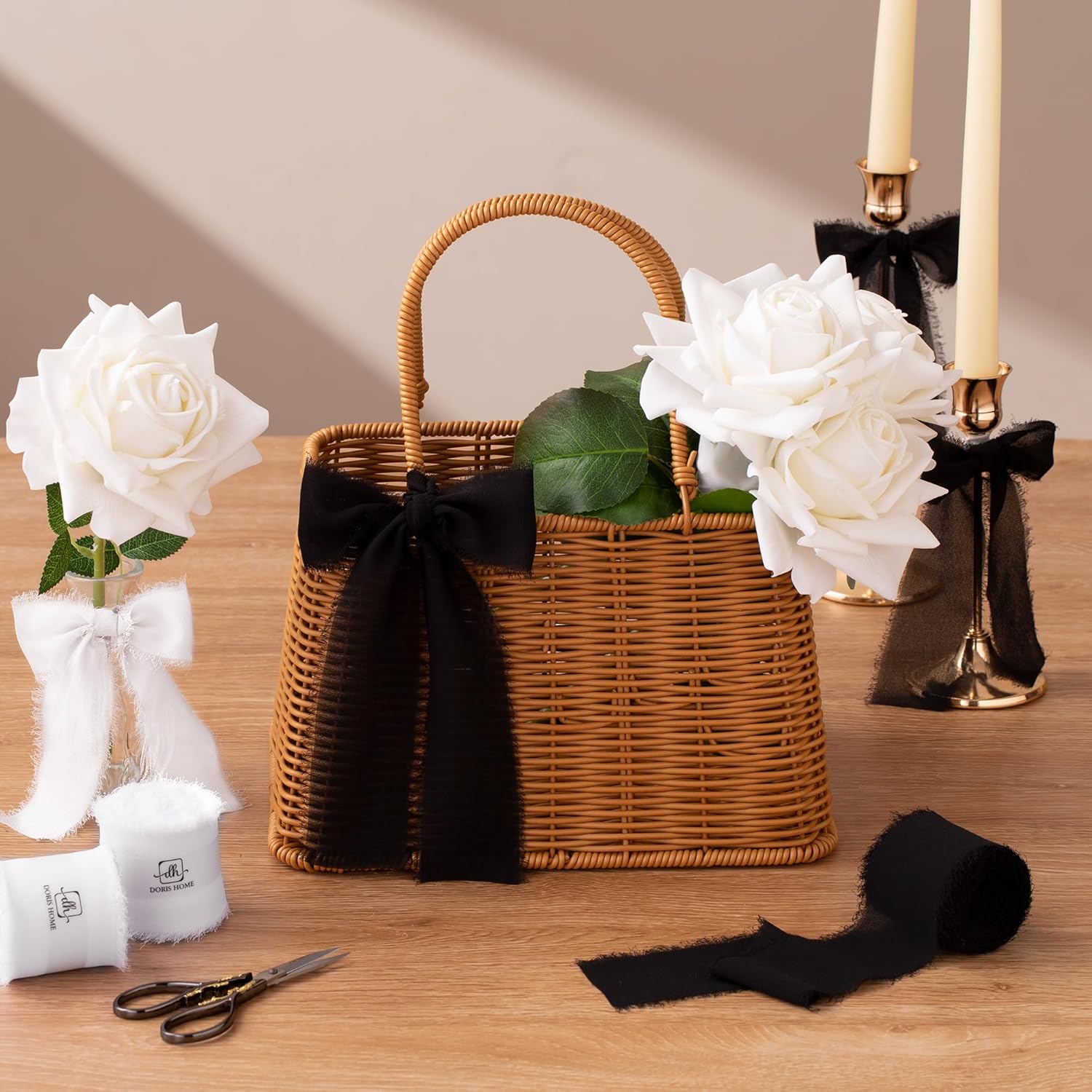 DORIS HOME 2" x21Yd Chiffon Ribbon for Flower Bouquet, Black & White Fabric Ribbon for Gift Wrapping, Handmade Frayed Ribbon for Wedding Christmas Decorations