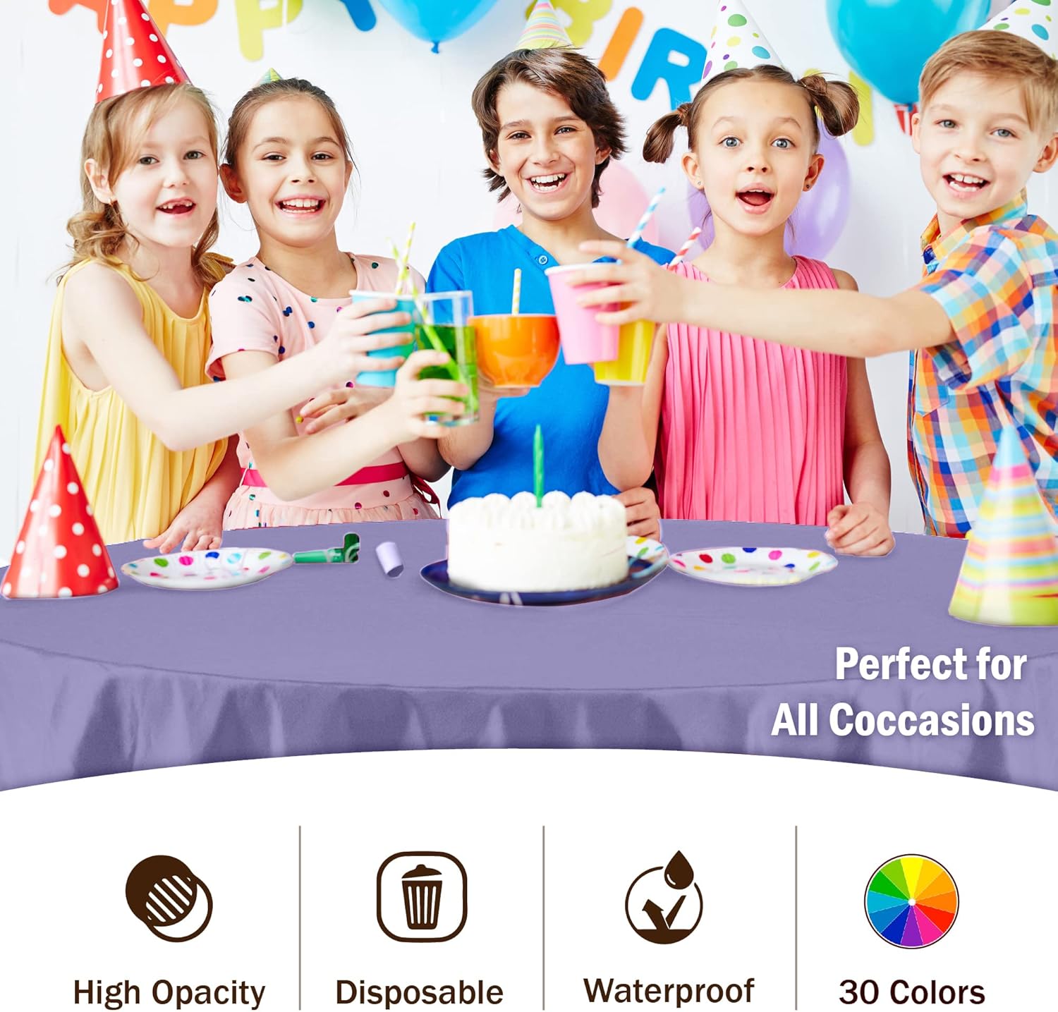 - PREMIUM QUALITY PROTECTION: This 12 pack of 84 in. Lavender Round plastic tablecloths will cover any table up to 7 feet. Unlike your typical paper table clothes these disposable table covers for parties are spill and waterproof!!!