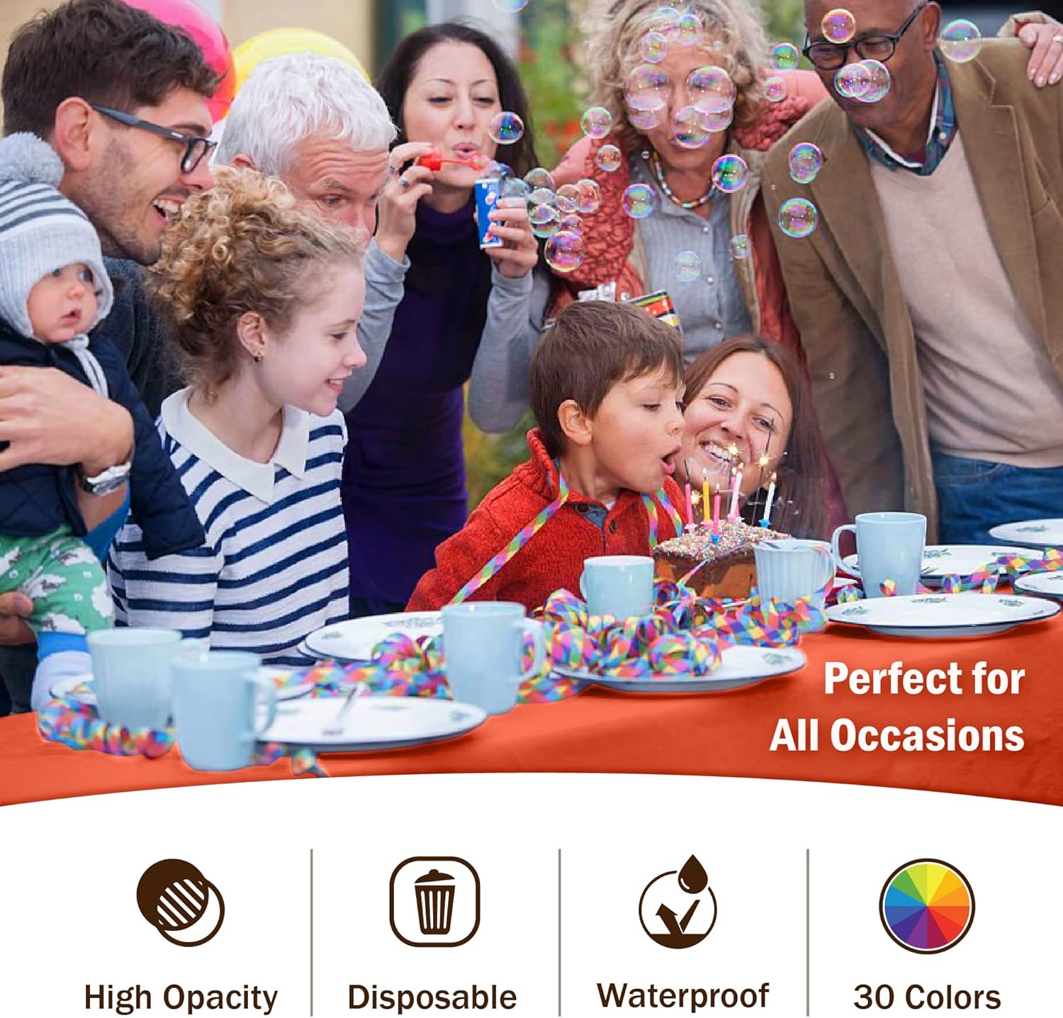 - HIGH OPACITY: covers any table with minimal transparency. Great plastic tablecoth for parties, weddings, holdiay party, , birthday parties, christmas, thanksgiving dinner, bbq, and any other color themed event.