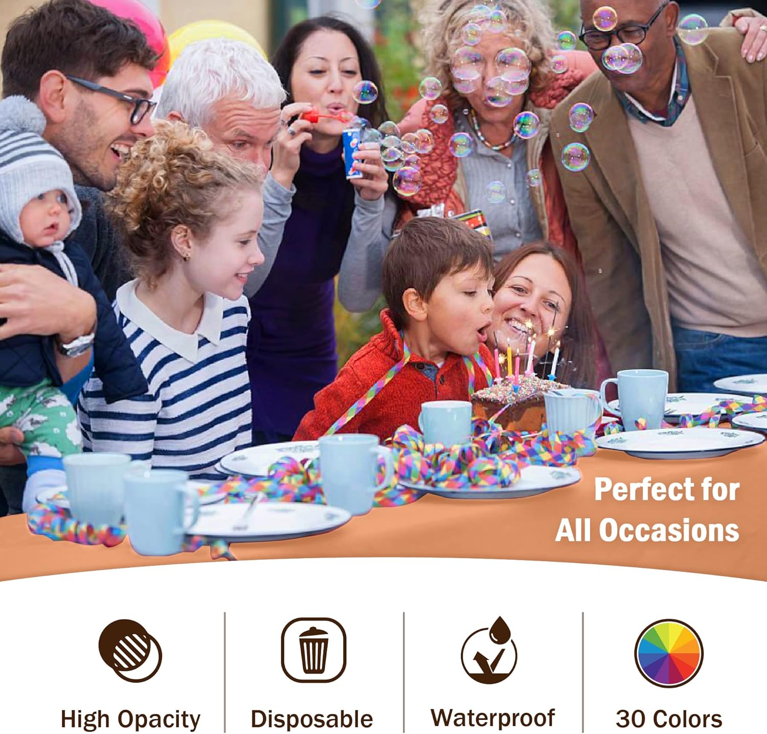 - HIGH OPACITY: covers any table with minimal transparency. Great plastic tablecoth for parties, weddings, holdiay party, , birthday parties, christmas, thanksgiving dinner, bbq, and any other color themed event.