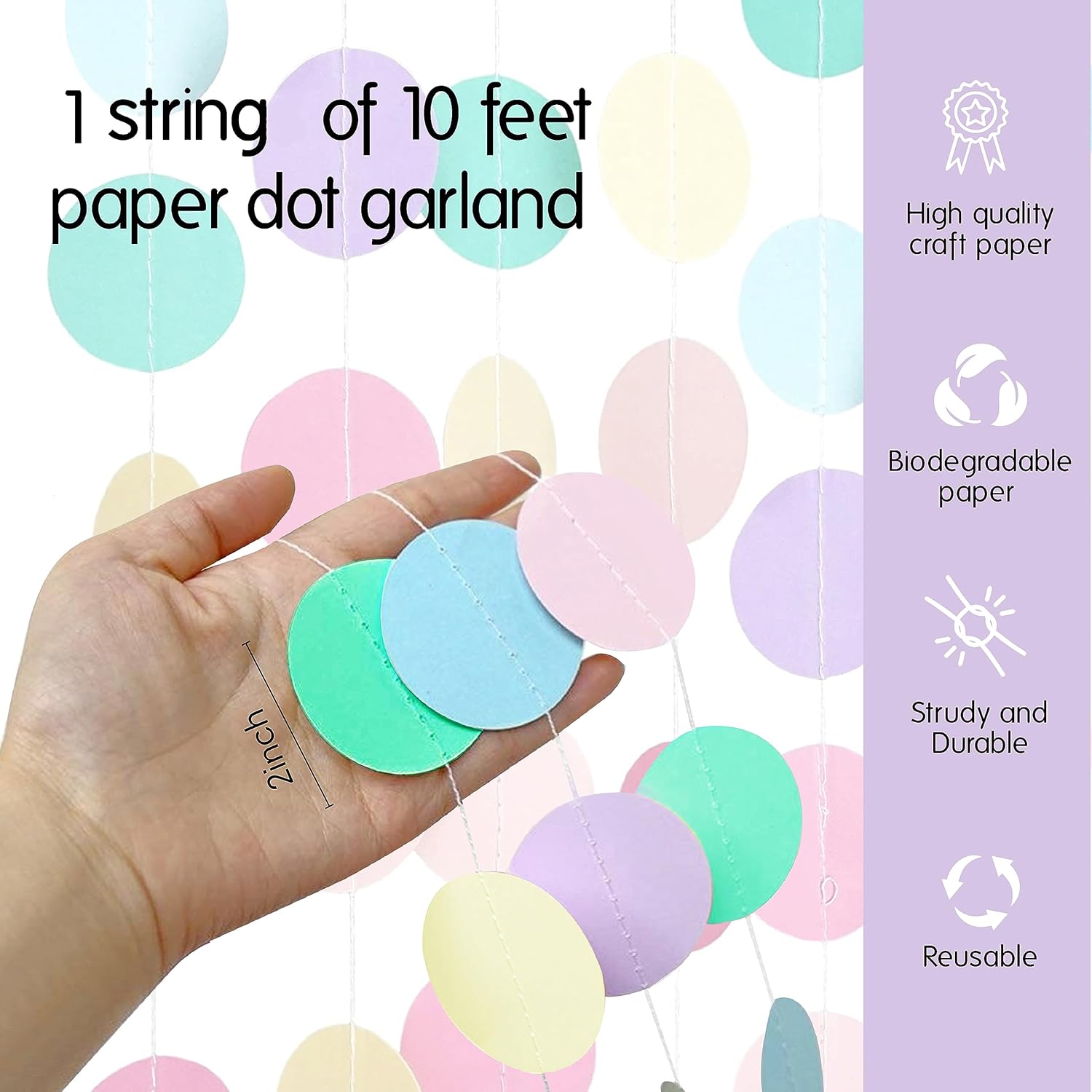 - METICULOUSLY HAND SEWN: Paper circle dots are hand sewn with each other at even intervals. Each circle dot measure approximately 2 inches in diameter- a versatile and universal size for all events!