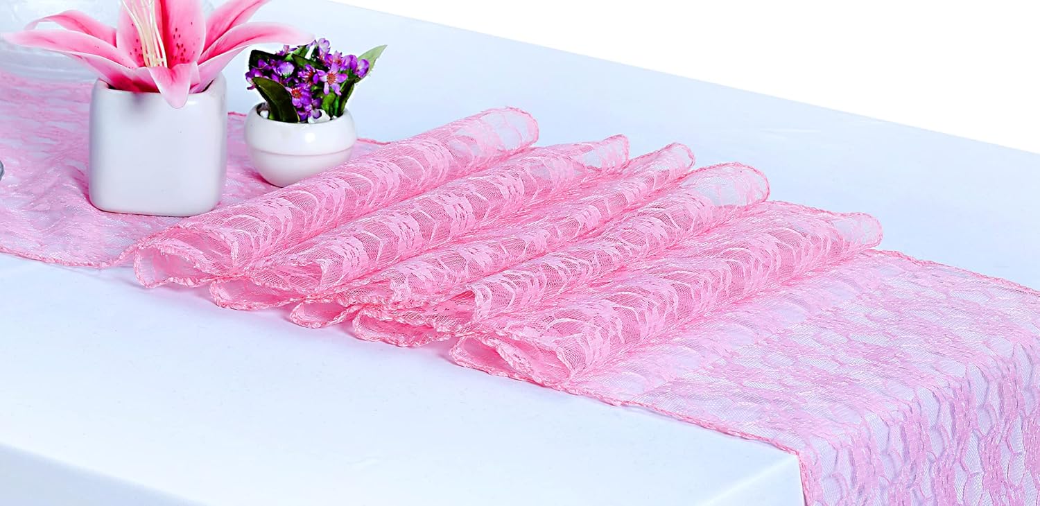 MDS Pack of 15 Wedding 12 x 108 inches Lace Table Runner for Wedding, Decorations for Birthday Parties, Banquets, Graduations, Engagements, and Runners fit Rectangle, Round Table- Pink