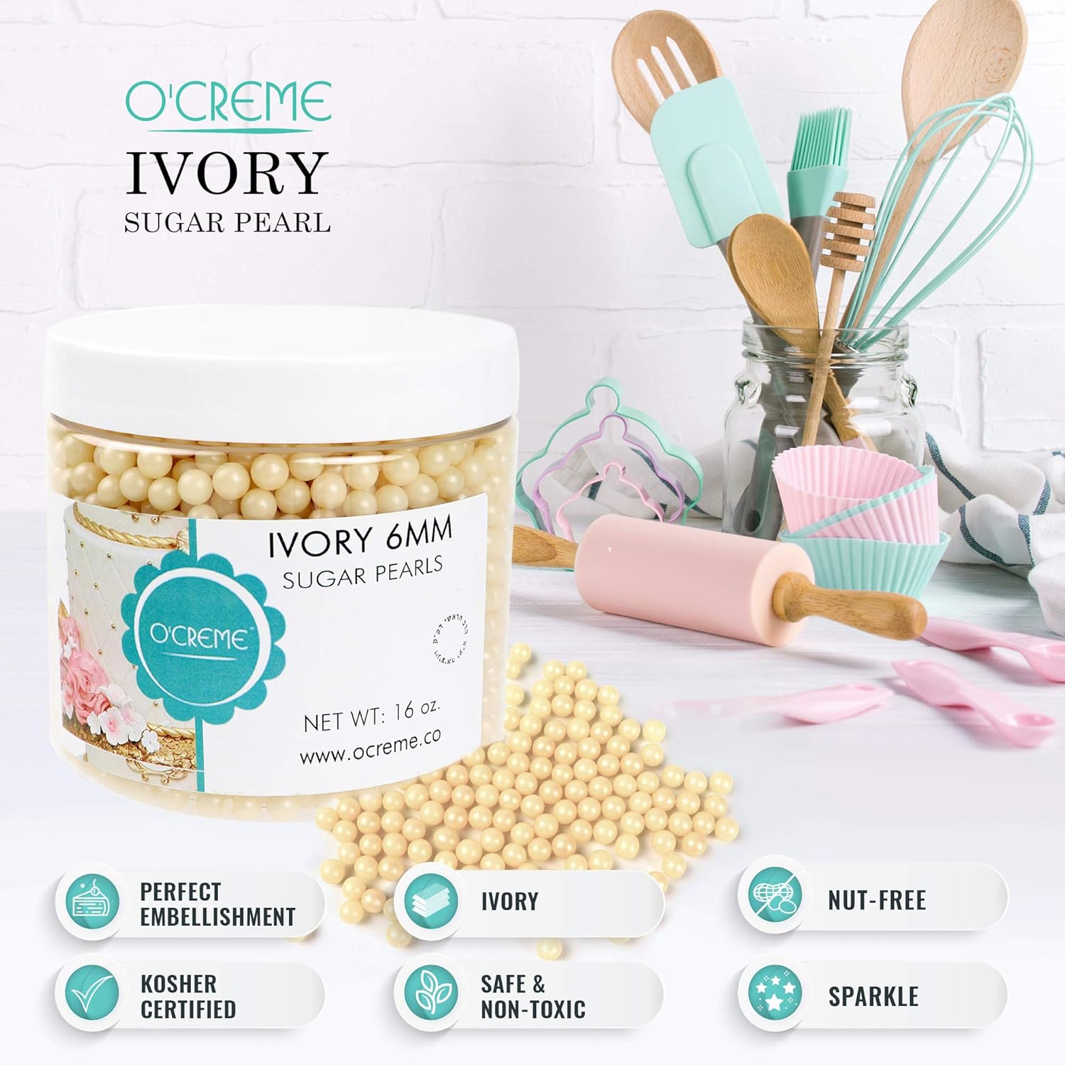 O'Creme Ivory Edible Sugar Pearls Cake Decorating Supplies for Bakers: Cookie, Cupcake & Icing Toppings, Beads Sprinkles For Baking, Certified, Candy Sugar Ball Accents (2mm, 16 Oz)