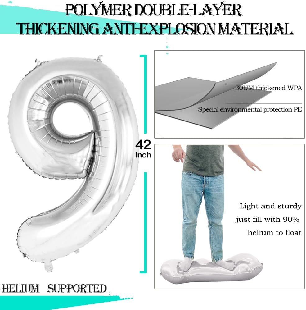 GOER Silver Foil Balloons Number 9,Huge Number Balloons for 9th Birthday Party Supplies Anniversary Decorations(3 pcs,42 inch,32 inc,16inch)
