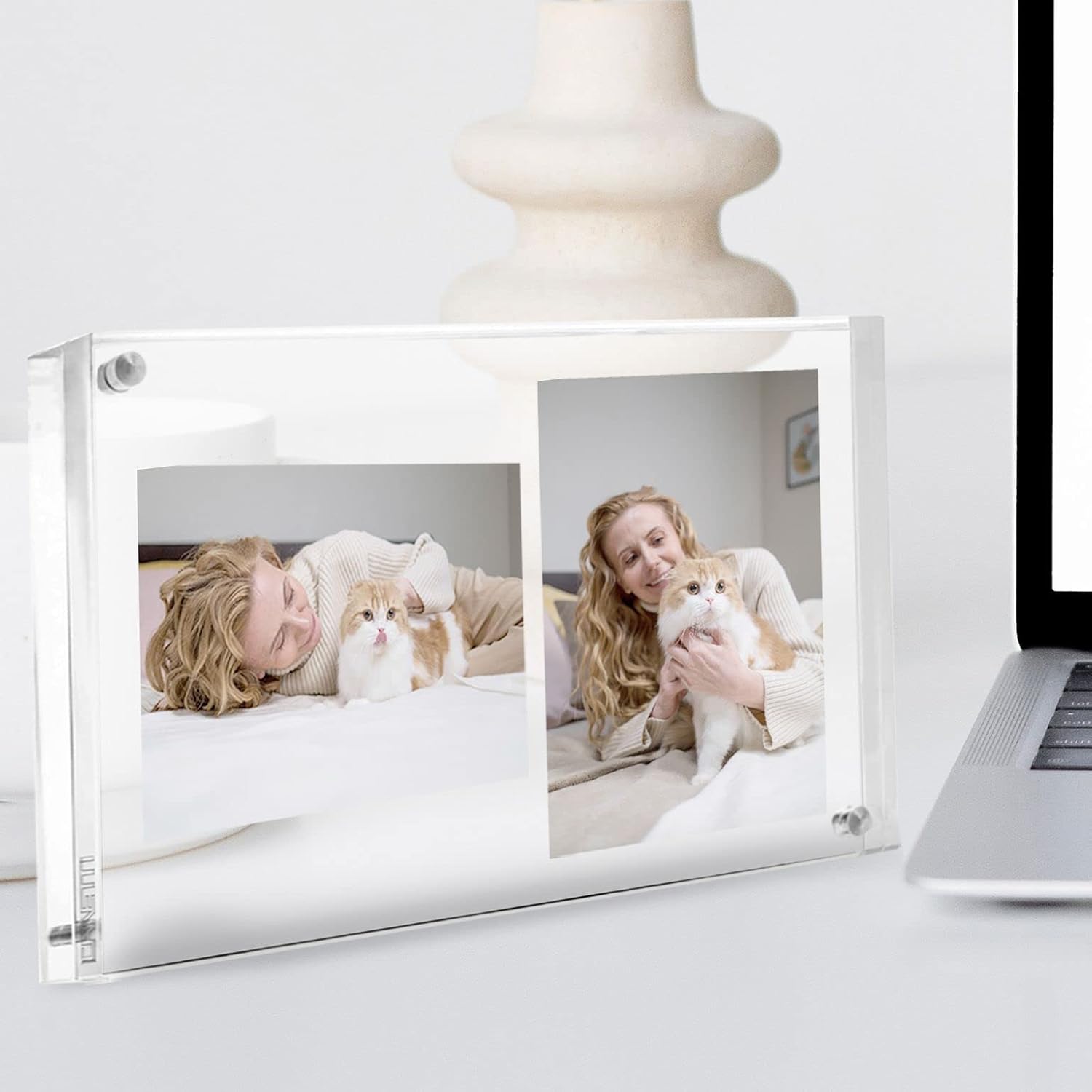 - UNIQUE DESIGN - This magnet frame has a frameless design with two thick solid acrylic panel, held together by tiny magnet points. It's easy to place and secure your pictures between the panels.