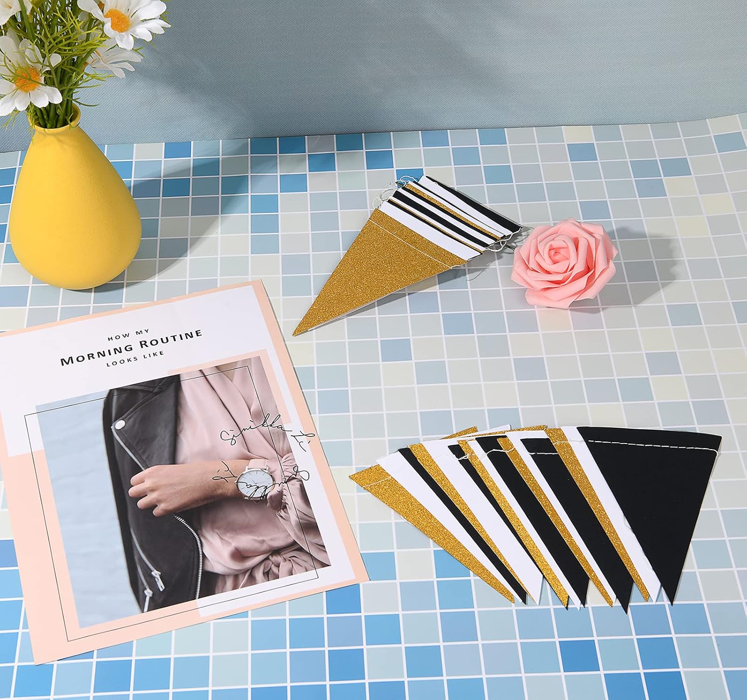 - AESTHETICALLY PLEASING - MerryNine Paper Triangles are enough quantities to fluff up your event! Use it as a photography backdrop, hang this gold shower curtain from the ceiling, around a table, under the verandah, or from branches in trees, throw the room; be It wedding, bachelorette party, children birthday, christening, baby shower, kitchen tea, nursery decorations, independence day, photo backdrop, or any other celebration.