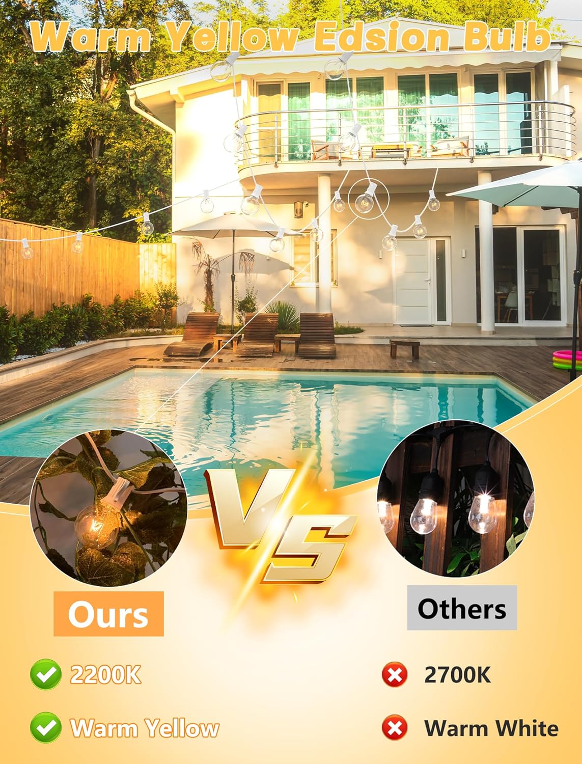 - 💡 Installation Suggestion of String Lights: Empty sockets be firstly and then install bulbs. Every bulbs should be separated, just in case high wind cause two bulbs too close to broken. Bulbs are glass fragile goods, please take it lightly. Do avoid hanging the string lights on outdoor when rainy or windy so as to prolong service life. For G40 replacement bulbs, pls search "B076MNN2D3".