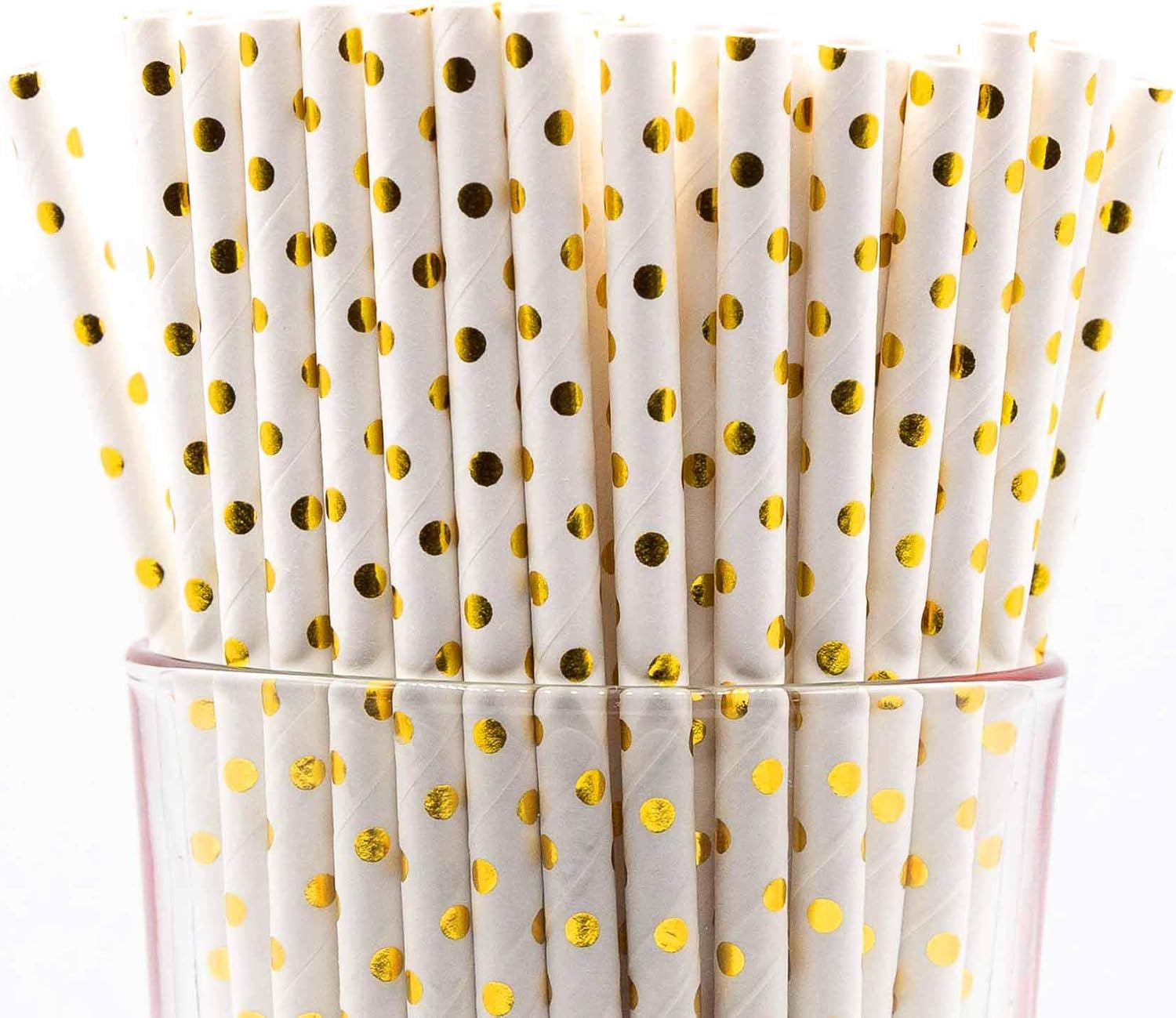- Pack of 150 Gold Polka Dot Foil wrapped paper straws that are 7.75” long and have a diameter of 0.25”. Made with 4-ply paper which translates into thicker and more resilient straws that won’t wilt or change shape in both hot and cold drinks.