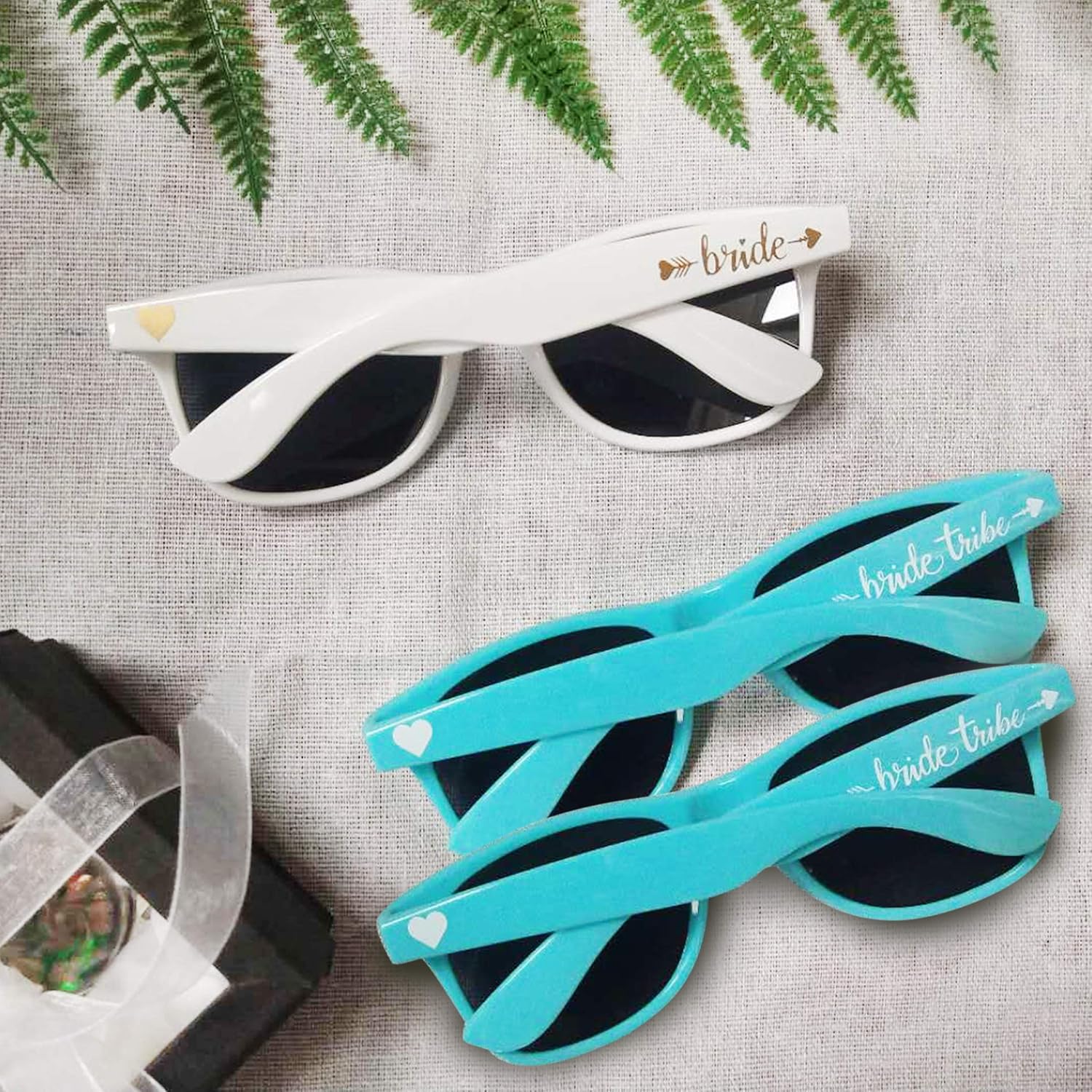 - Bachelorette Sunglasses Set---This Bachelorette Sunglasses kit contains a total of 1 Pair of white 'Bride' Sunglasses, 9 Pairs Blue 'Brides tribe' Sunglasses for bridesmaid. Great idea for Bachelorette party and bridal party.