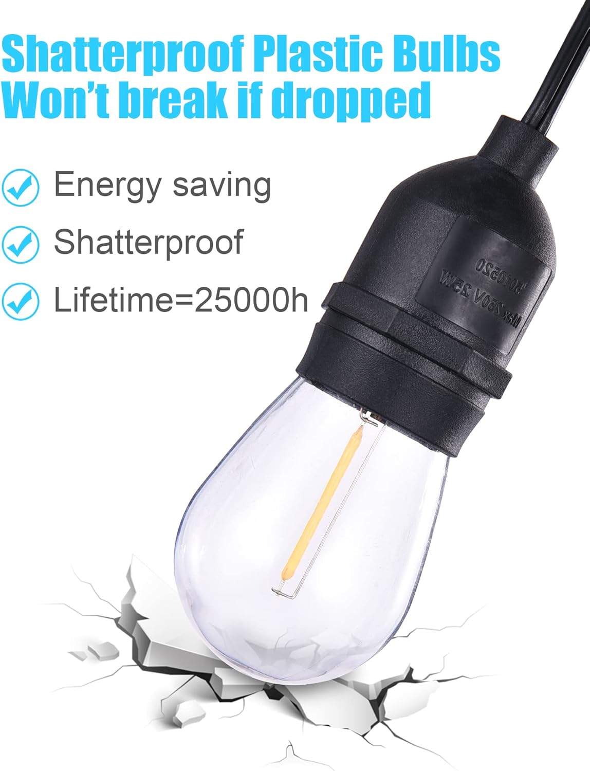 - Shatterproof Bulbs: Never stress when storm or hurricane set in because this outdoor patio string lights won’t broke if dropped. Comes with 26 shatterproof plastic bulbs, including 2 spares, to give you peace of mind all year round.