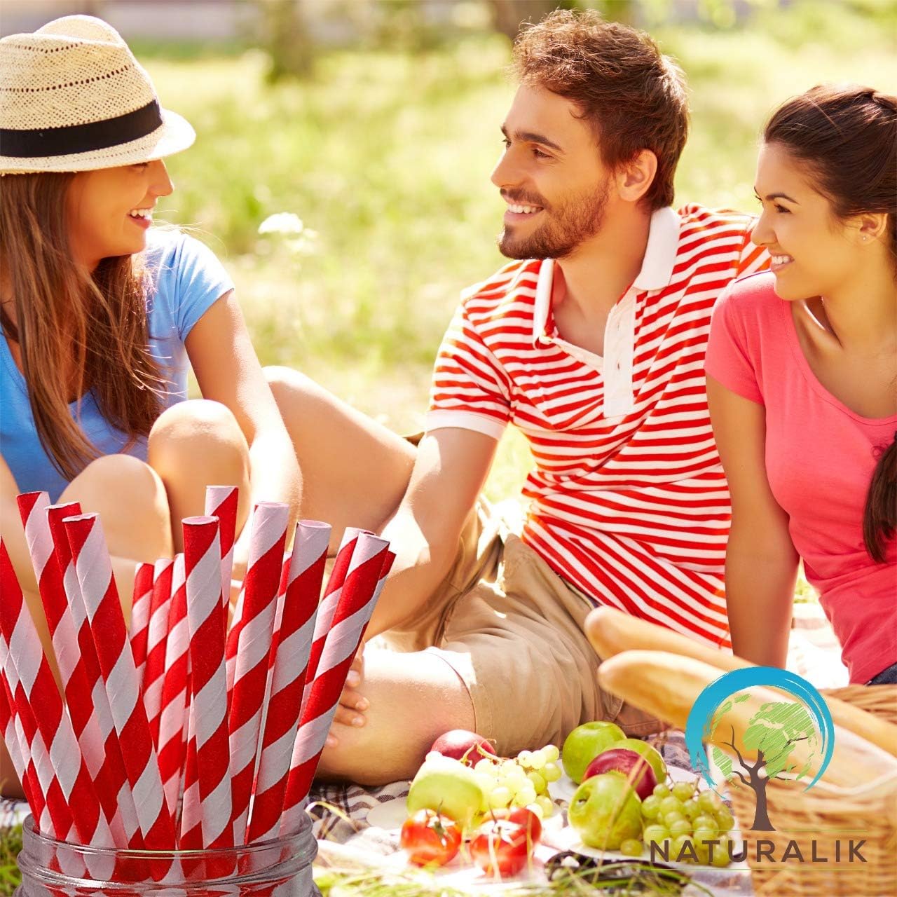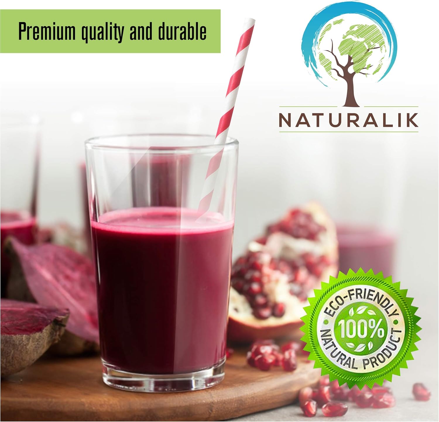 - NATURALIK 300pc Premium Red paper straws made with 1/3 more material than regular paper straws which makes them extra durable and sturdier. They are toxin free, taste and odor free. 7.75" long, 0.25" diameter. Bulk Paper Straws for Juices, Smoothies, Party Decorations and Restaurants.