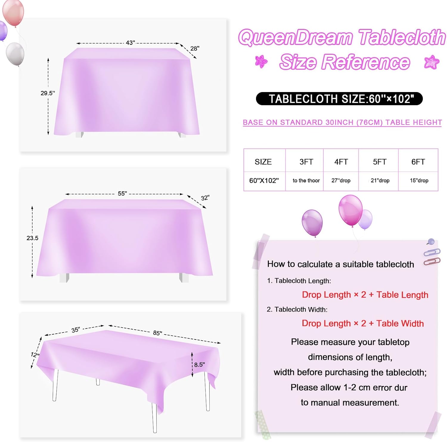 - QueenDream Warm Tip: The pictures below are for your reference ONLY and make sure your tablecloth size looking through the size picture.If you have any questions about the product, please feel free to contact us.