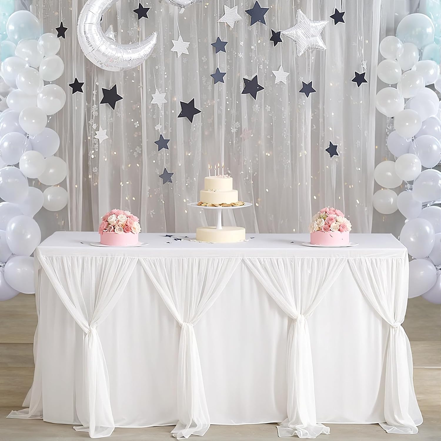 - White table tulle skirt two usages: 1.all white tulle are naturally drooping, making your party more colorful.2.White tulle and white tulle can be freely cross-bundled together, and decorated with flowers, lights, balloons, etc., making your indoor and outdoor birthday party wedding baby shower more romantic and elegant.