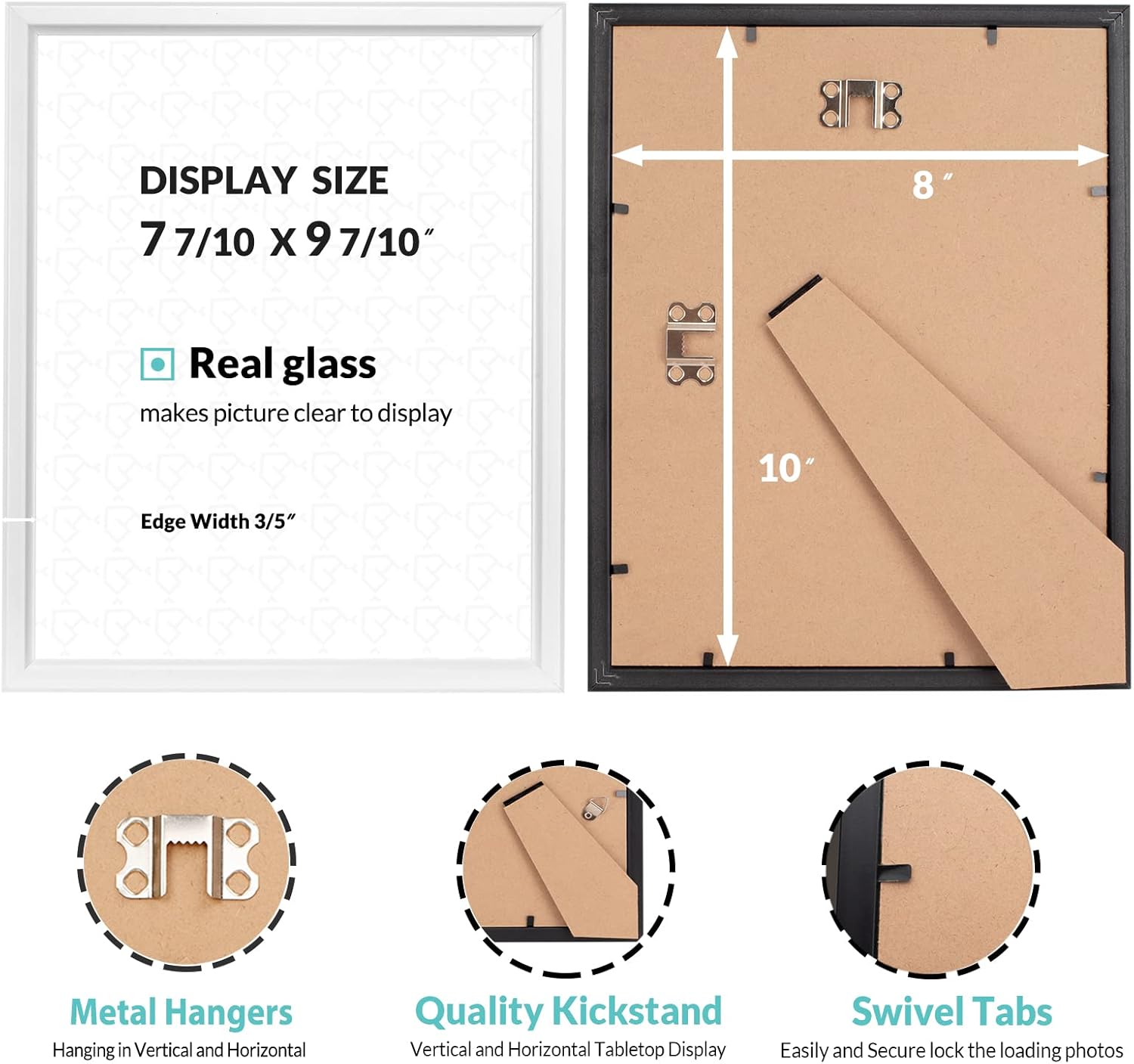 - PACKAGE INCLUDES - Set of 12 black frames, fits standard 8x10 inches pictures, photos, prints, with real glass to protect against dust and moisture. Tips: wall hooks or fasteners are not included in the package.