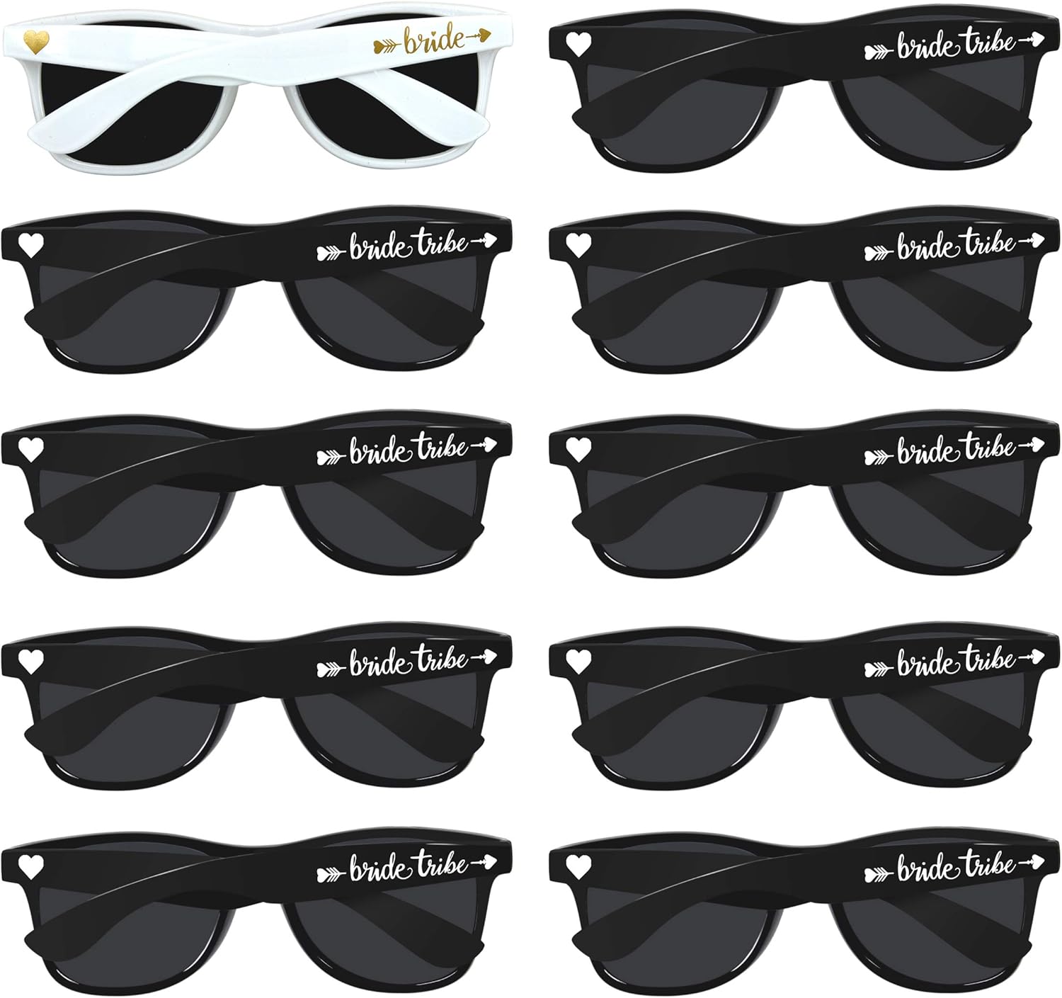 - Bachelorette Party Sunglasses Set---This Bachelorette Sunglasses decorations kit contains a total of 1 Pair of white 'Bride' Sunglasses, 9 Pairs Black 'Brides tribe' Sunglasses for bridesmaid. Great idea for Bachelorette party and bridal party.