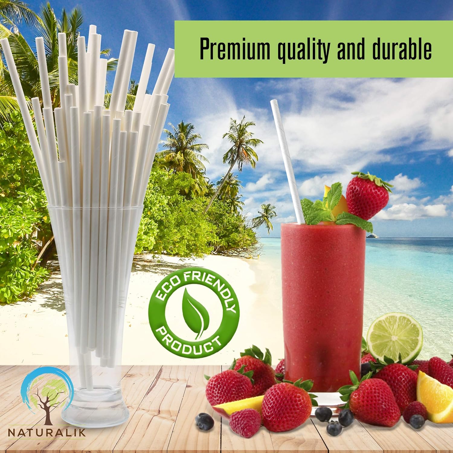 - NATURALIK 300pc Premium White paper straws made with 1/3 more material than regular paper straws which makes them extra durable and sturdier. They are dye-free, toxin free, taste and odor free. 7.75" long, 0.25" diameter. Bulk Paper Straws for Juices, Smoothies, Party Decorations and Restaurants. Also available in bulk packs of 1000pc. Search B07NTLGWDB on Amazon.com