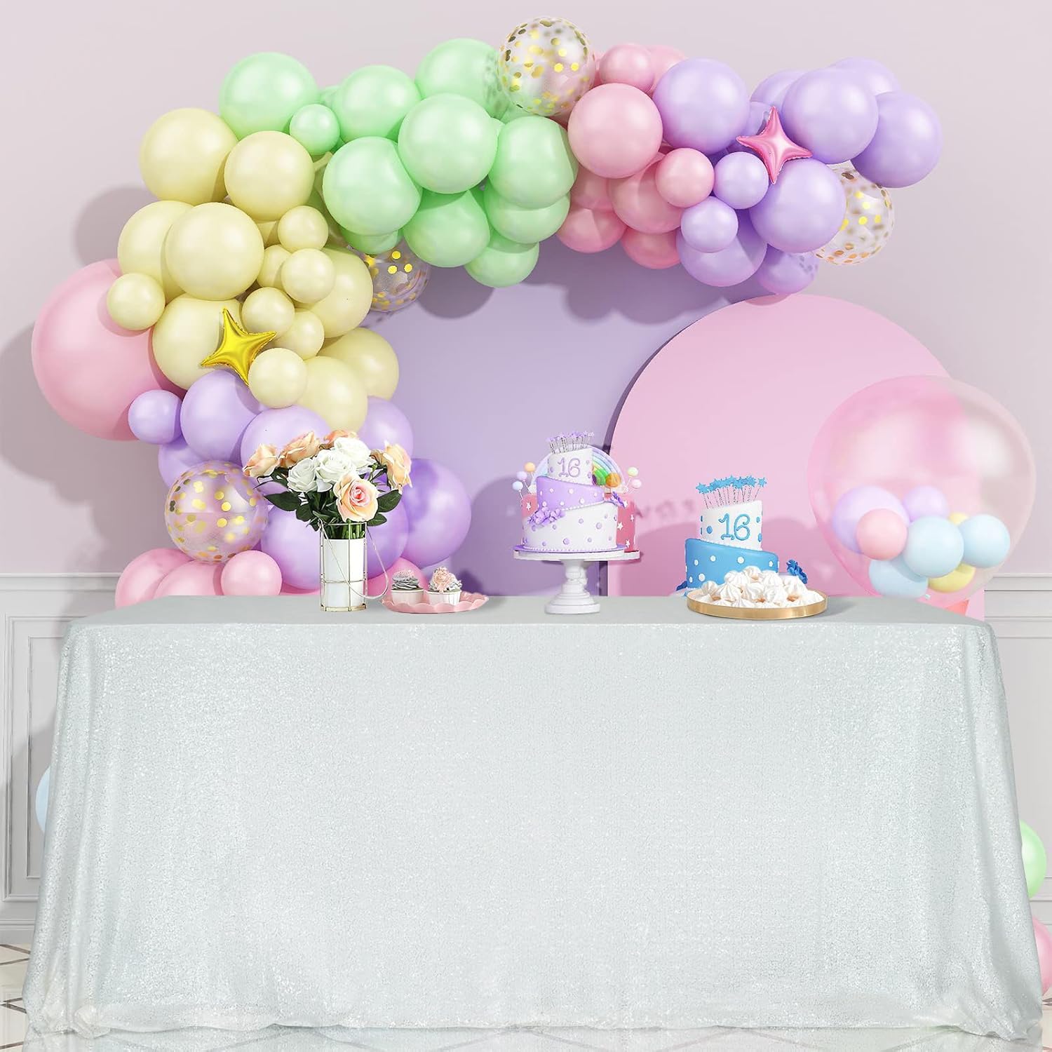 - Material: This is a very beautiful tablecloth. Countless sequins are sewn on the mesh fabric, which not only adds color, but also reflects light, shining like stars.