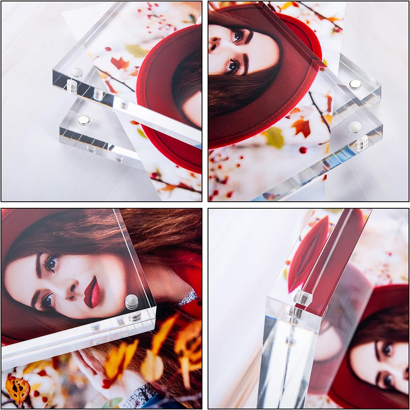 - ★【Magnets Frame】Magnetic Photo Frame with 4 pairs of strong magnets in each corner to make the two clear acrylic blocks hold the pictures tightly and neatly. Powerful magnets would not cause any damage of the photos, and you can install and switch the photos easily.
