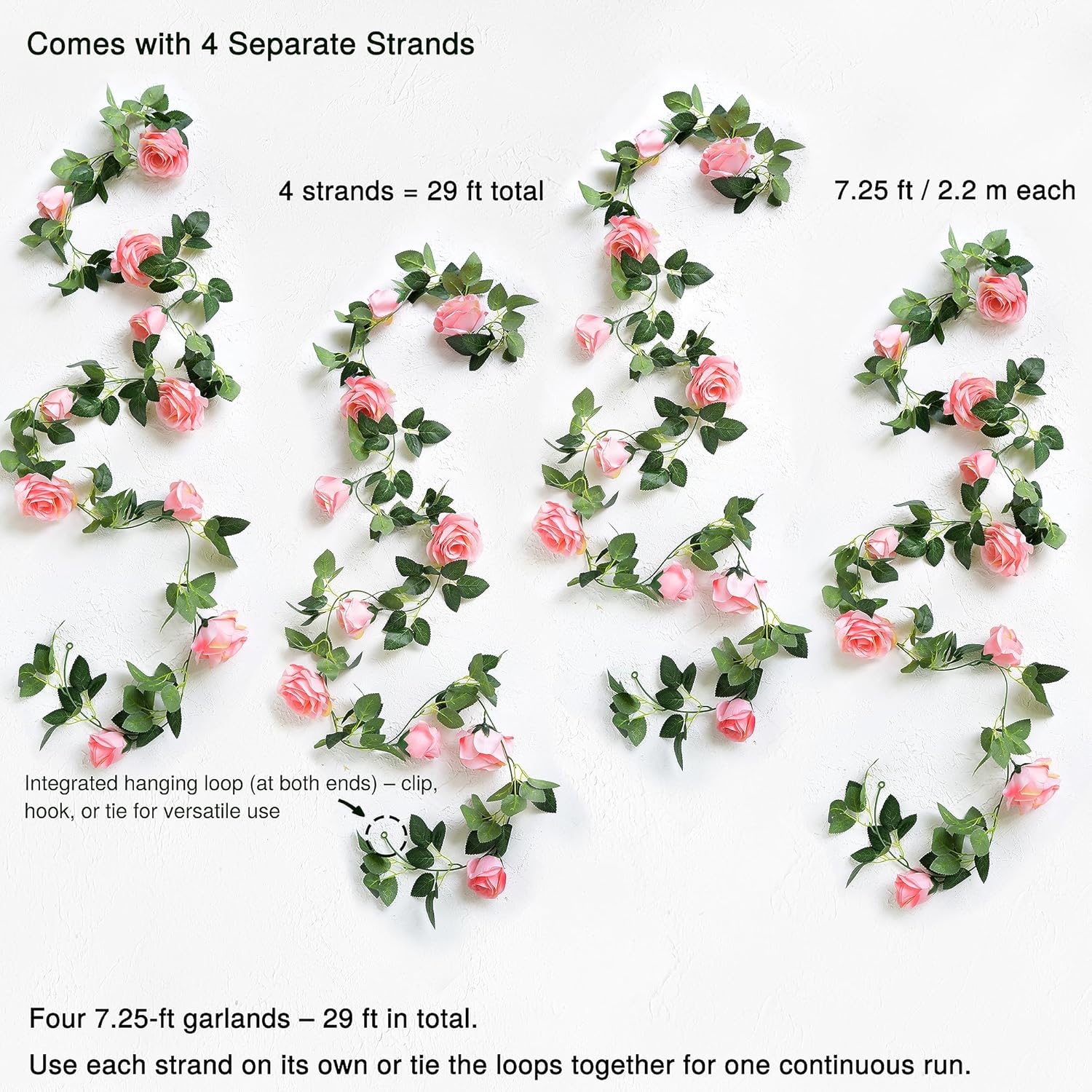 - Each set includes 4 individual artificial rose garlands, each approximately 7ft long, totaling 28ft when combined. Each strand is bundled separately and must be fluffed and joined to achieve full 28 ft length;
