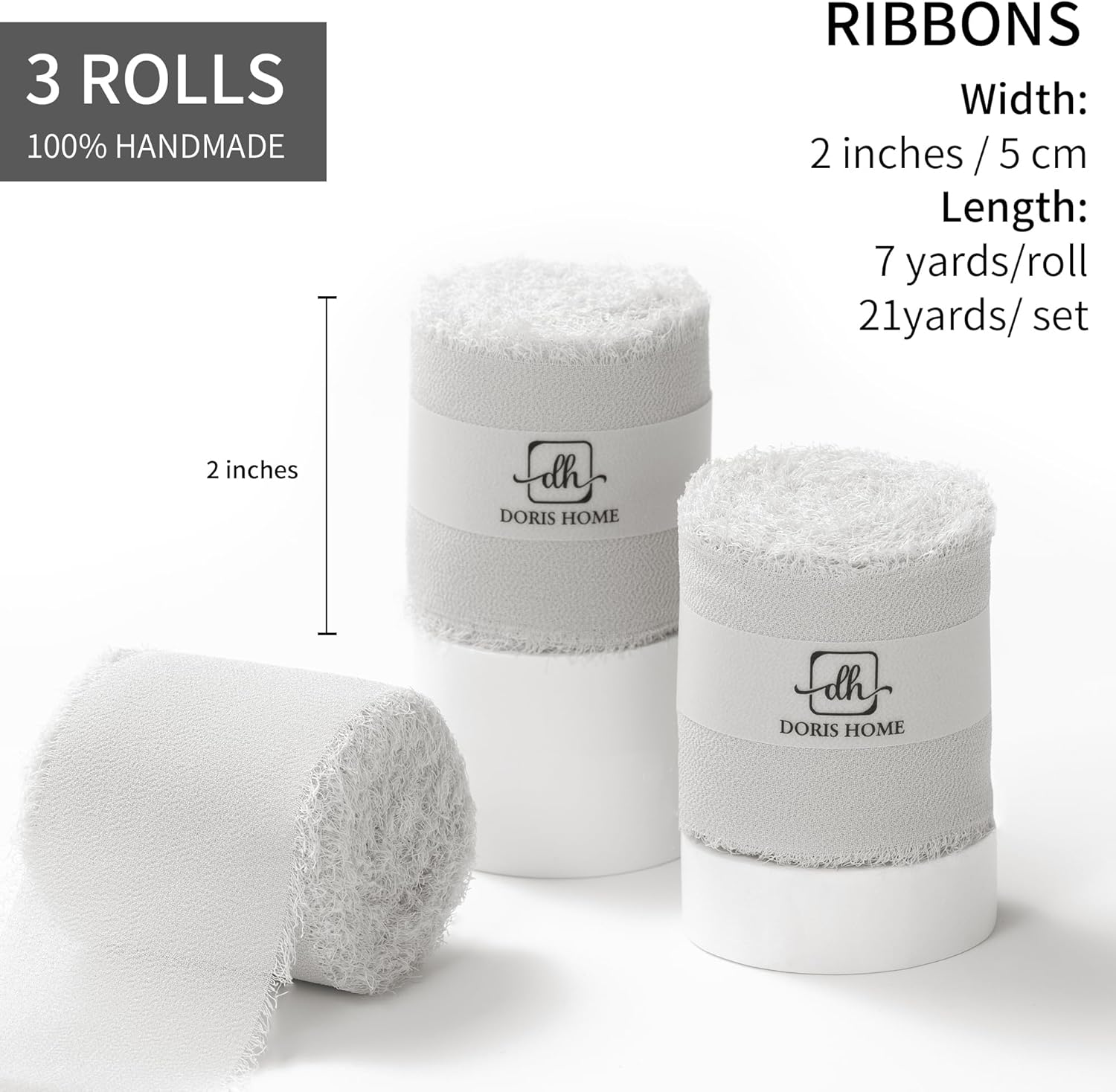 - 【Size and Color】Each roll of chiffon ribbon is 2 inches wide and 7 yards long, perfect for various creative uses such as making bows, decorating wreaths, and DIY crafts. This set includes 3 rolls light grey ribbons. These vibrant frayed ribbons add a rustic charm to your creations, ideal for bouquet wrap or gift ribbon.
