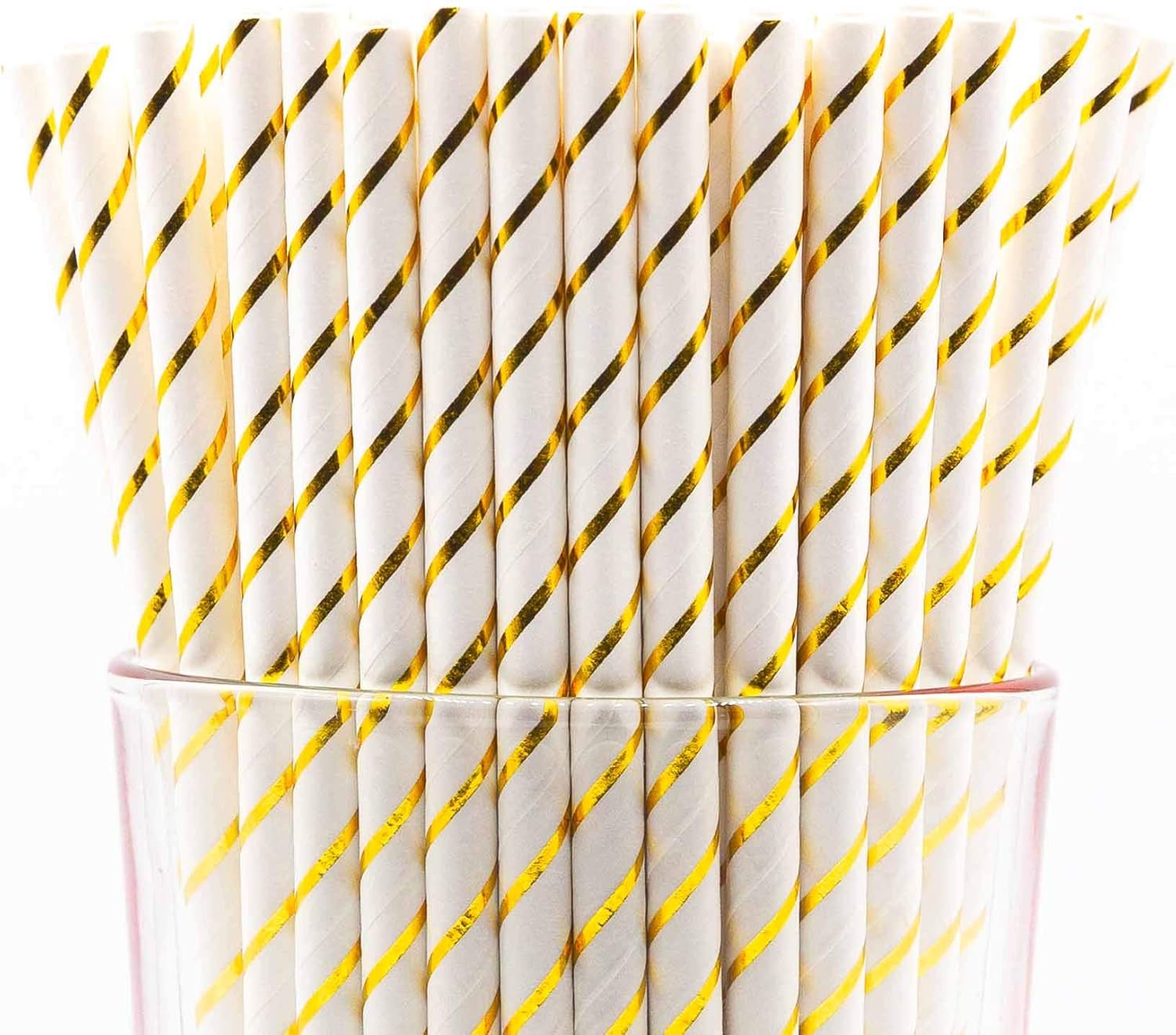 - Pack of 300 Gold Stripes Foil wrapped paper straws that are 7.75” long and have a diameter of 0.25”. Made with 4-ply paper which translates into thicker and more resilient straws that won’t wilt or change shape in both hot and cold drinks.