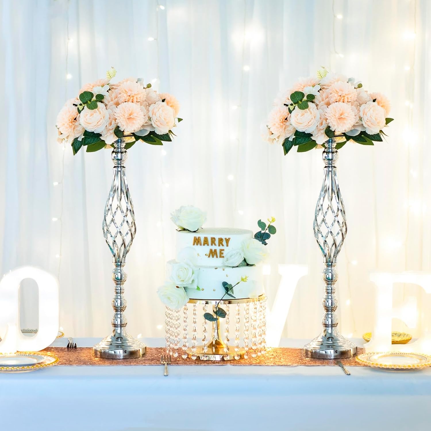 LANLONG 2pcs Metal Silver Candle Holders Road Lead Table Centerpiece Stand Pillar Candlestick for Wedding Candelabra Flowers Vases