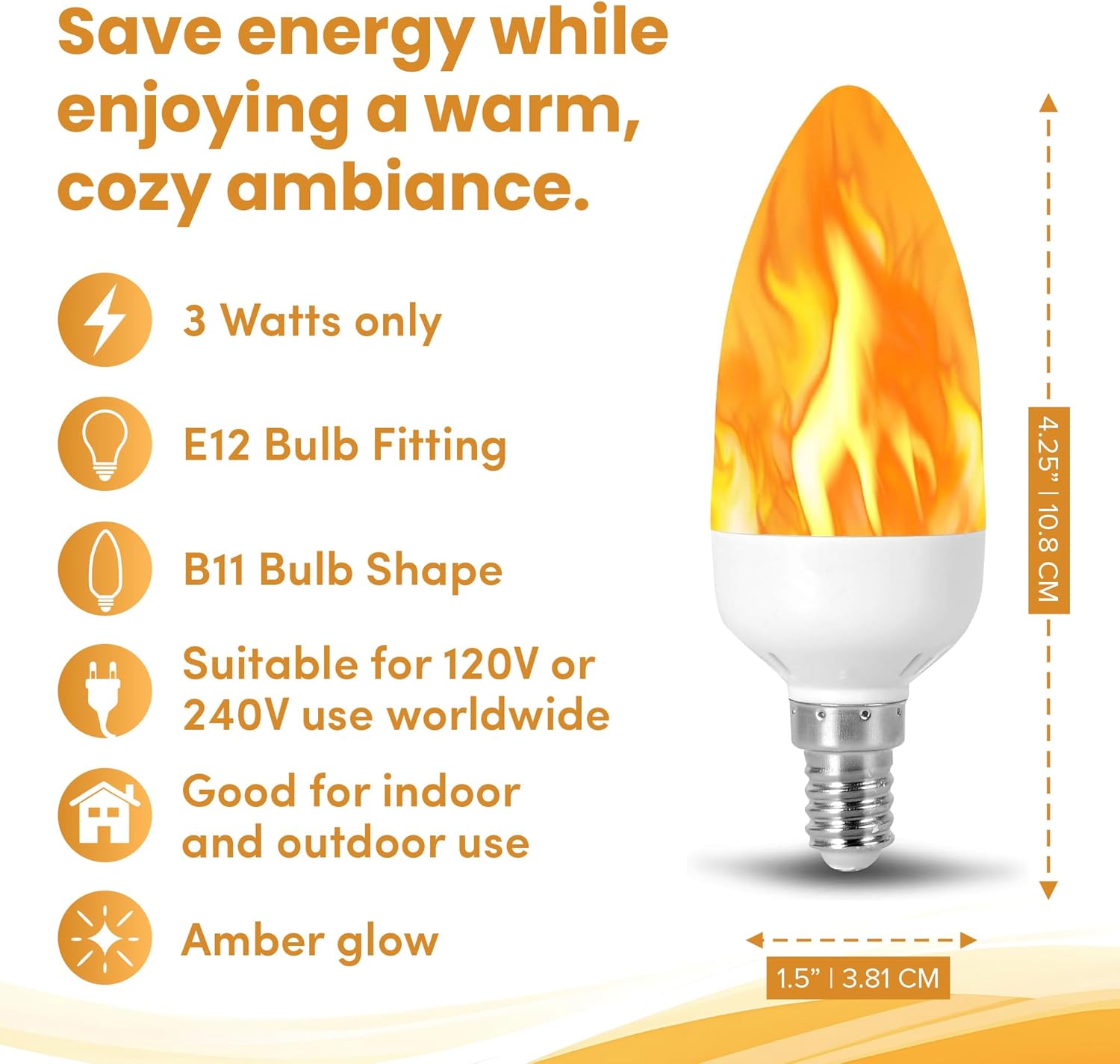 Flame Effect Chandelier LED Fire Candle Light Bulb Flaming Flicker E12 Candelabra Base Shape Novelty Lighting B11 Replacement Bulbs 12mm Diameter Fitting, 110MM / 4.25" Total Length 120V - 3 Pack