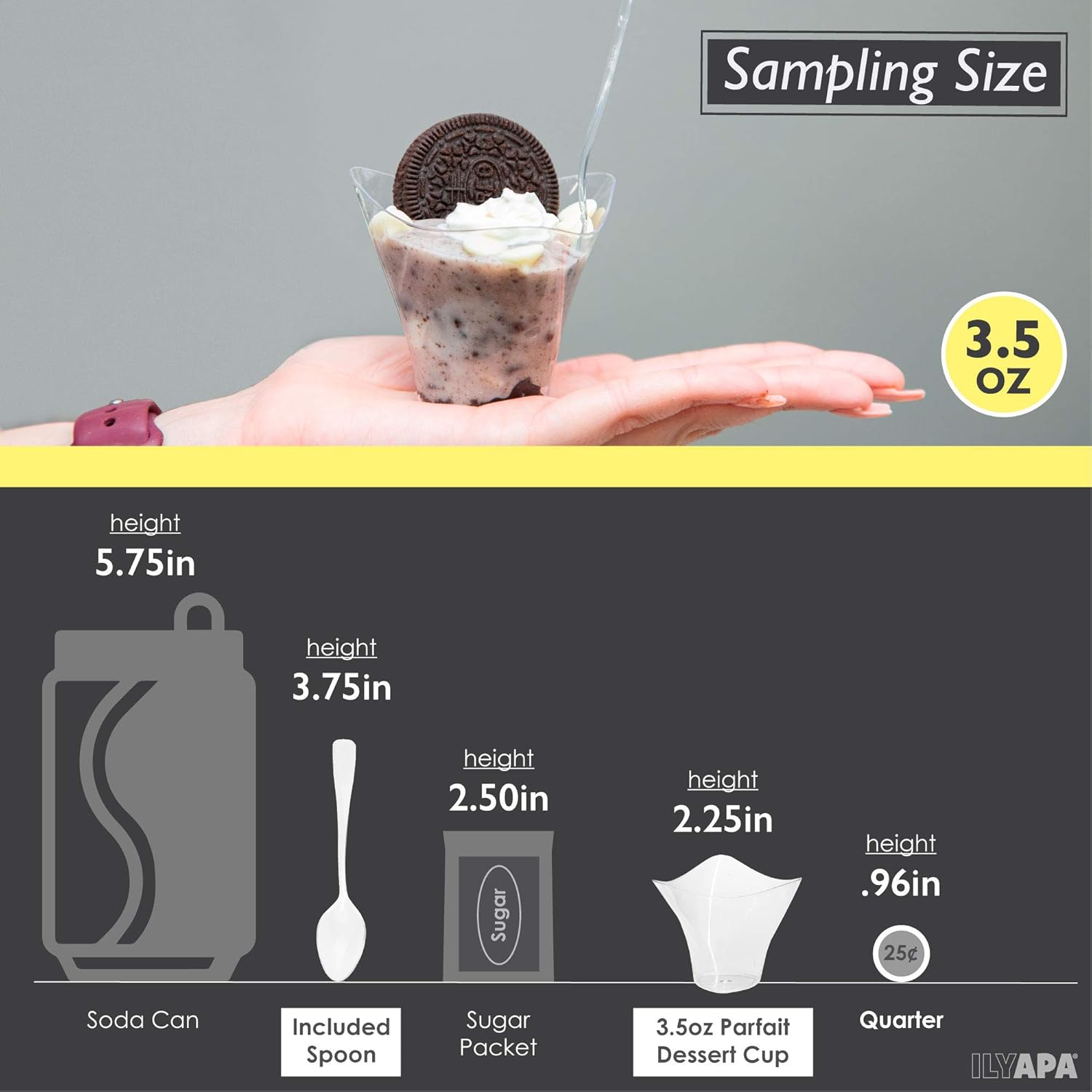 - Satisfaction Guaranteed - ILYAPA stands behind all of its products 100%. We use strong durable packaging to guarantee that your mini plastic dessert cups arrive in the best condition possible.
