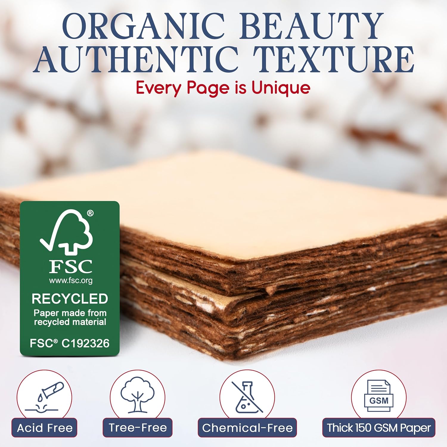 - Material : 100% recycled cotton rag fibers form the base of this eco-conscious handmade paper., 150 GSM cotton fiber paper, ideal for watercolor and fountain pen use., Artisans handcraft this paper from sun-dried cotton and natural fiber blends., Cotton-based paper with antique deckle edge crafted without chemicals or wood pulp., Crafted from acid-free cotton, ensuring durability and archival-quality preservation., Eco-friendly material includes cotton remnants upcycled from garment production., Hand-processed cotton pulp forms the foundation of this premium deckle edge paper., Handmade using raw cotton pulp, naturally dried under the sun., Made from long-fiber cotton for strength, texture, and minimal bleed-through., Natural cotton pulp is used to create a soft yet durable surface for writing and art., Natural materials like cotton and water combine in small-batch artisan production., Pure cotton base enhances ink absorption and supports multiple artistic media., Sustainably sourced cotton rags are transformed into thick, textured art paper., Tree-free cotton paper made from textile waste using traditional Indian methods. 100% recycled cotton rag fibers form the base of this eco-conscious handmade paper., 150 GSM cotton fiber paper, ideal for watercolor and foun… See more