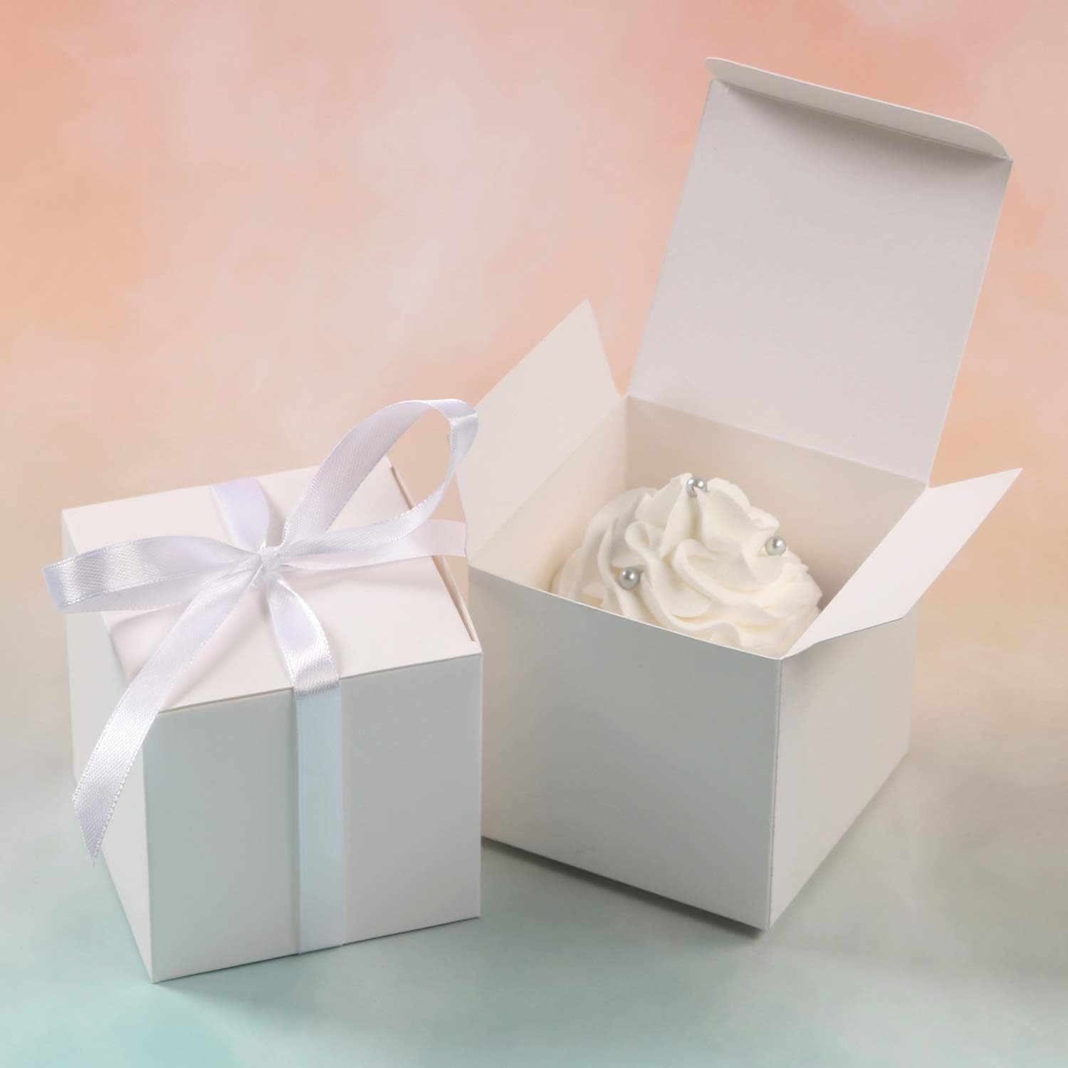 COTOPHER 100pcs Wedding Favor Boxes, Paper Gift Boxes 3x3x3 Inches Small Gift Boxes with Ribbons Small Boxes for Gifts, Crafting, Cupcake, Candy, Bridesmaid Proposal Boxes,Easy Assemble Boxes (White)