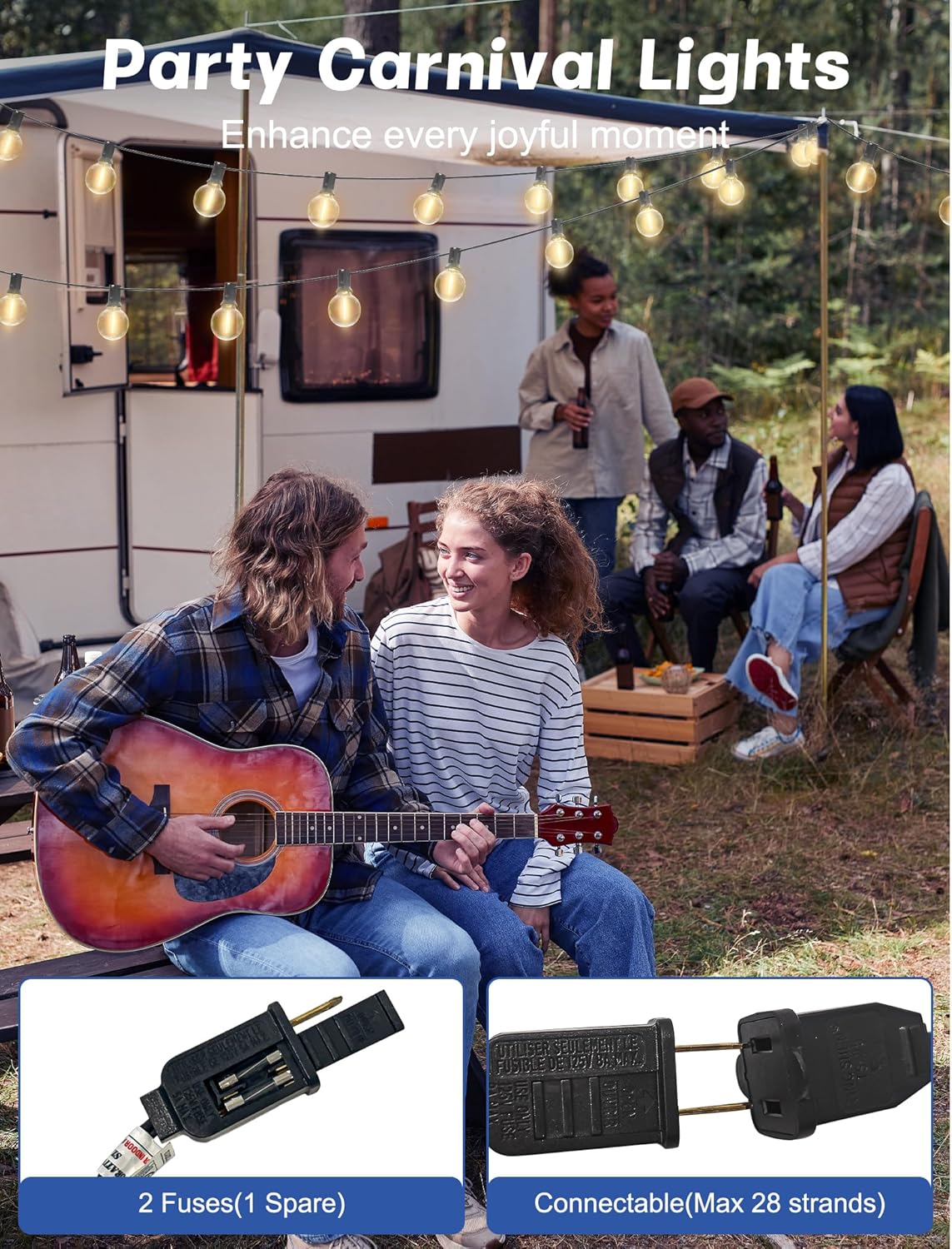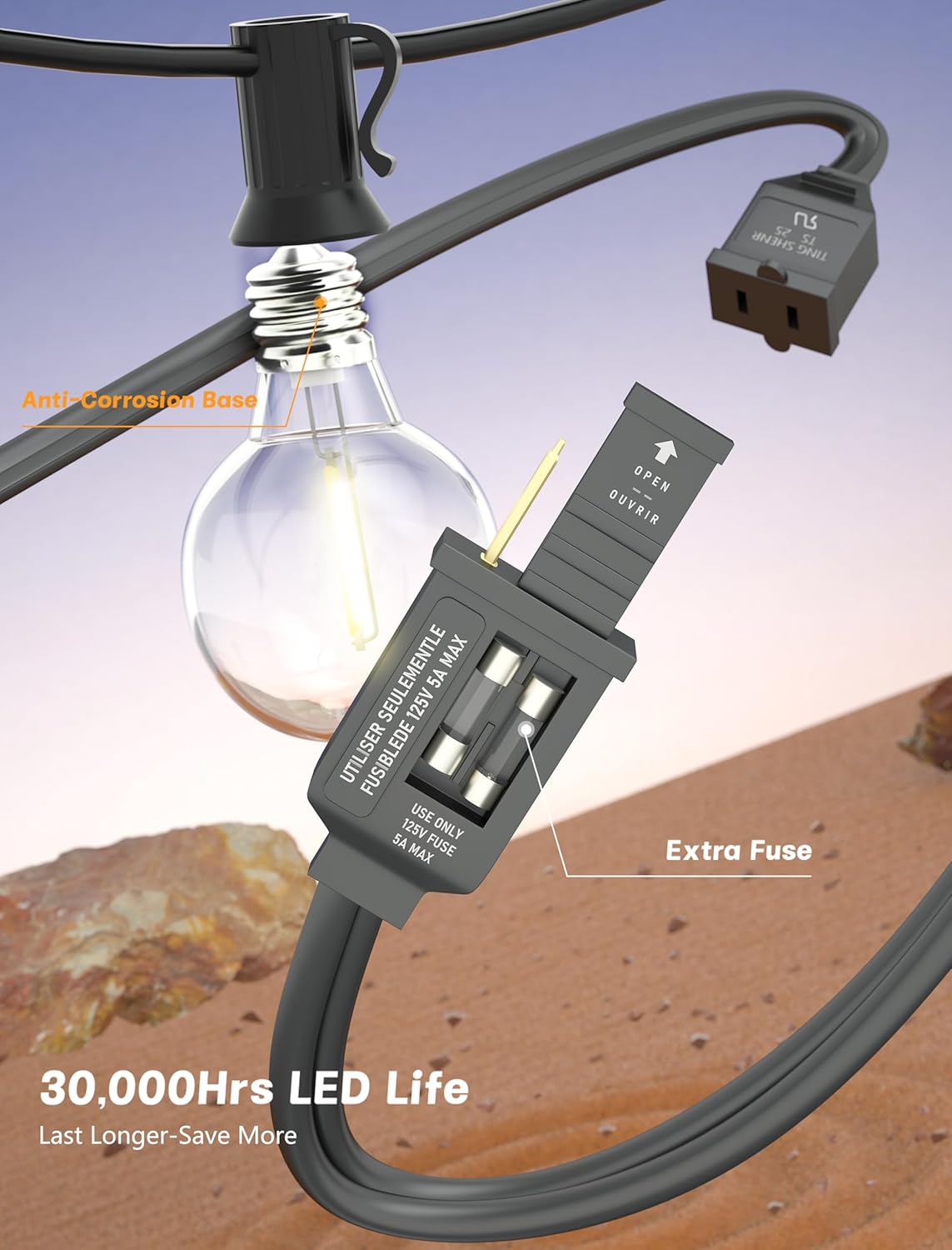 - Practical & Easy to Install: This g40 string lights is very easy to install with a cable tie or cup hook, fix it or place it anywhere as you need. The gazebo lights very flexible and practical, a light bulb that goes out does not affect other lighting bulbs, Safe and durable electric string light either with an E12 socket base and a built-in spare fuse for easy replacement