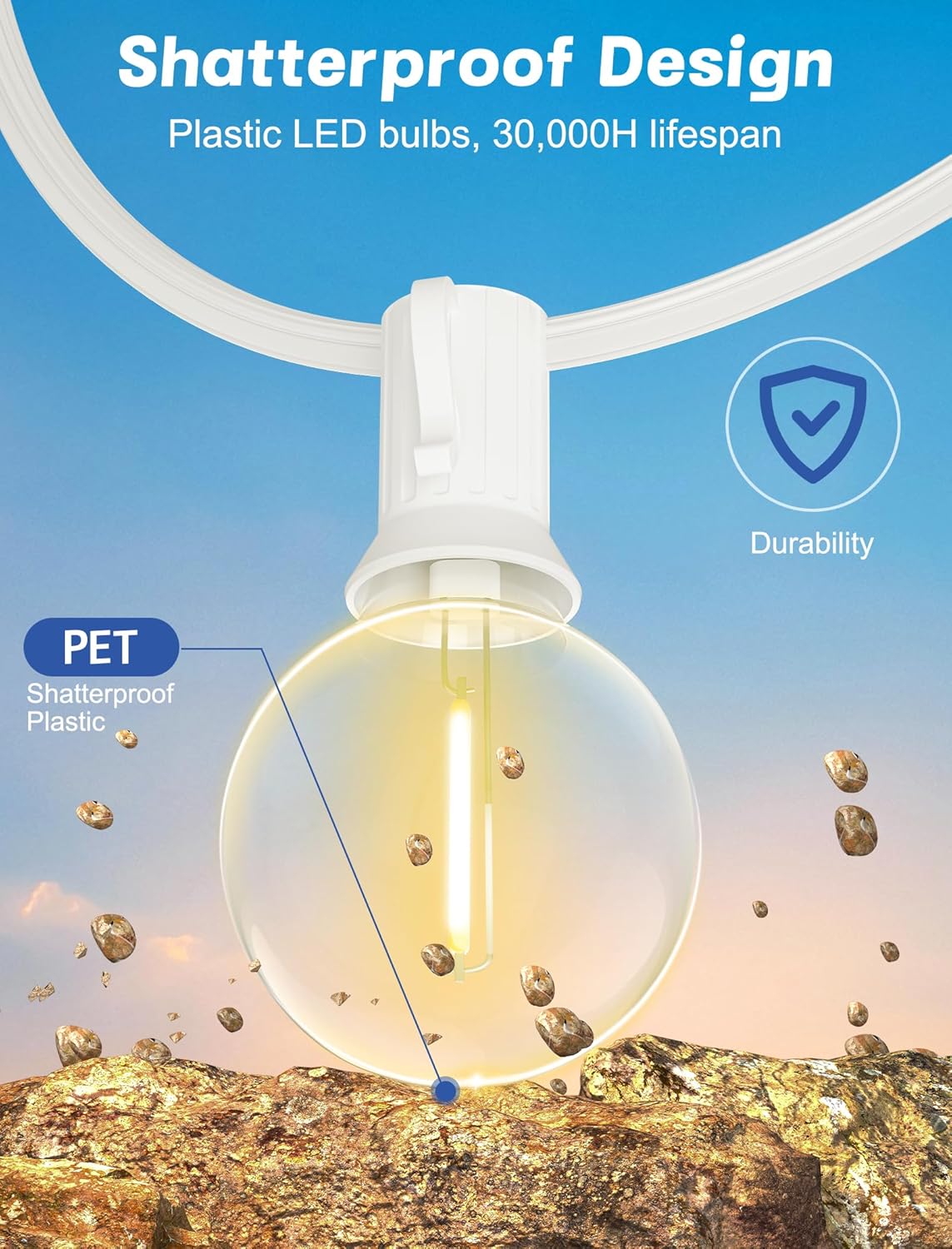 - Practical & Easy to Install: This outdoor decorative light string is very easy to install with a cable tie or cup hook, fix it or place it anywhere as you need. The G40 white patio string lights is very flexible and practical, a light bulb that goes out does not affect other lighting bulbs, Safe and durable electric string light either with an E12 socket base and a built-in spare fuse for easy replacement