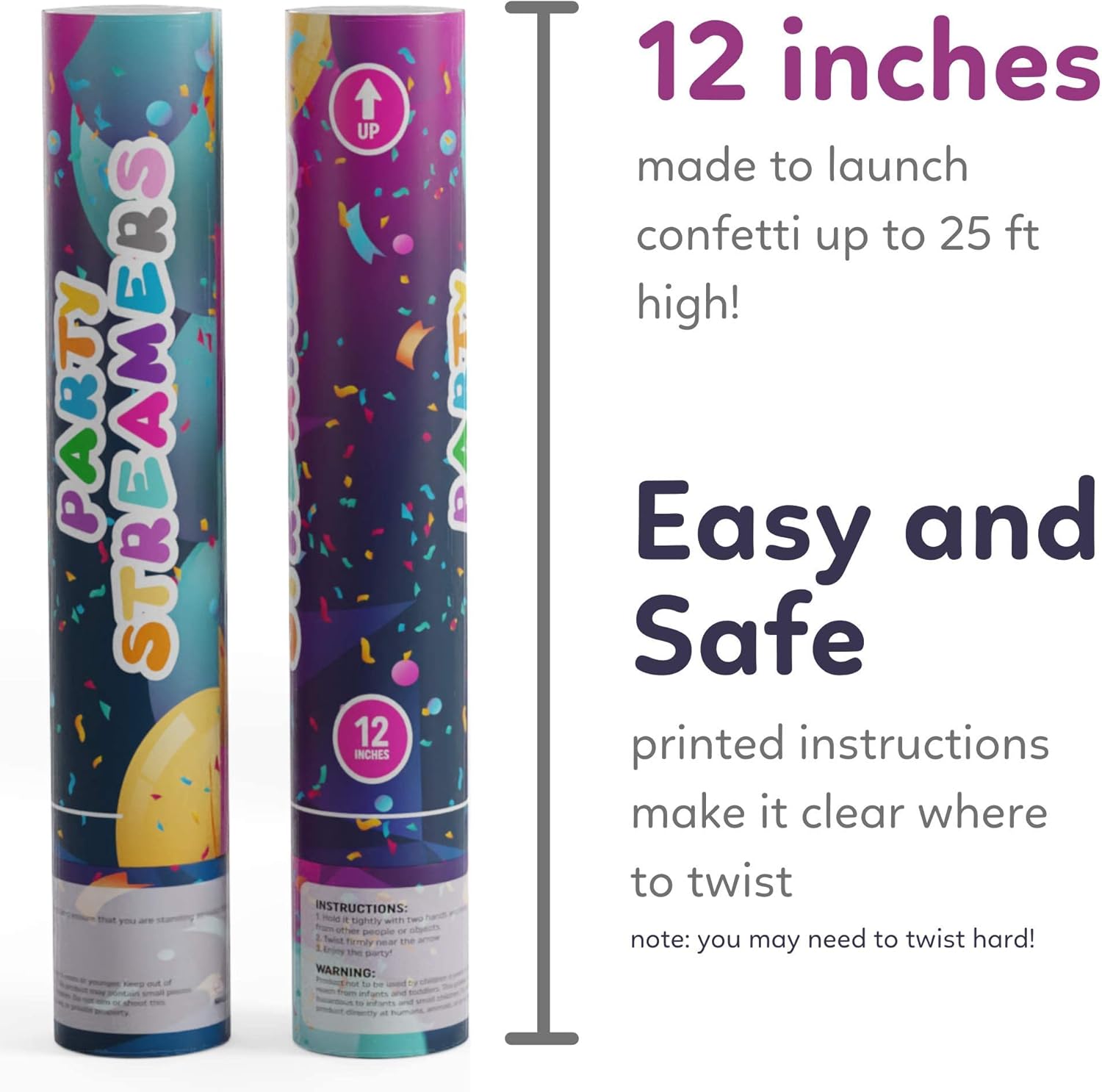 - EASY TO USE AIR POWER! Just a simple twist at the very bottom part of the cannon releases a beautiful display of multicolored confetti. Each cannon is built of a durable tube that is PACKED full of confetti for an exciting pop of confetti that flies up to 35 feet!