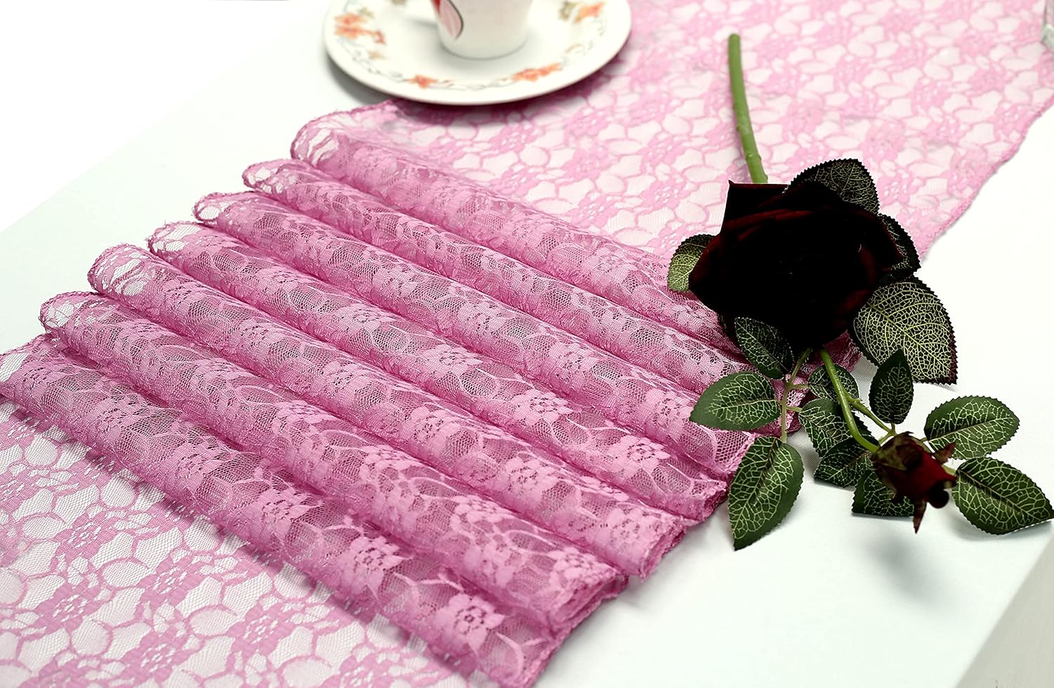 MDS Pack of 15 Wedding 12 x 108 inches Lace Table Runner for Wedding, Decorations for Birthday Parties, Banquets, Graduations, Engagements, and Runners fit Rectangle, Round Table- Dusty Pink