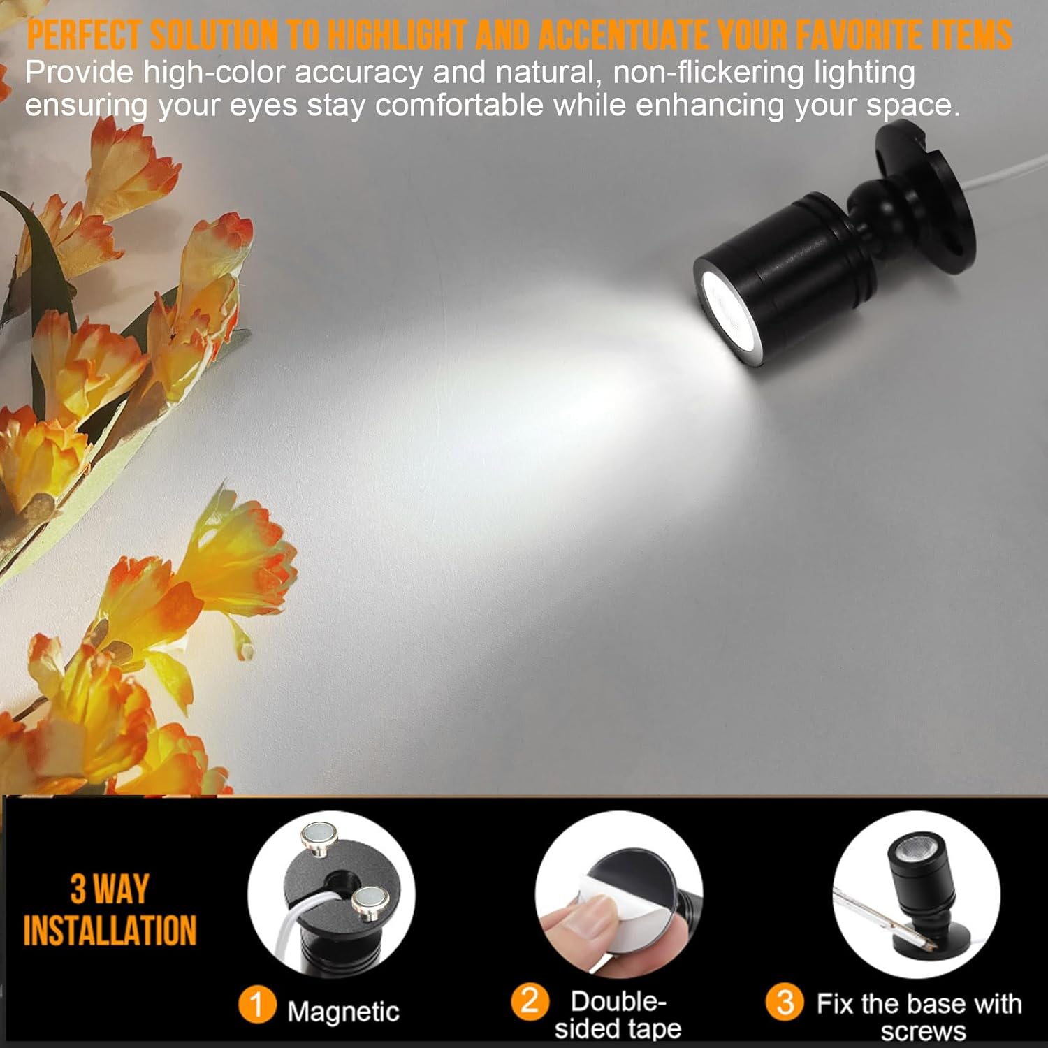 - 【Multipurpose spot light】Elevate your interior with our multipurpose spotlights – the perfect solution for accentuating and highlighting your cherished possessions. Whether it's artwork, plants, pictures,display case,cabinet,collectible toys, or jewelry, these accent lights are designed to draw attention to the items you hold dear.