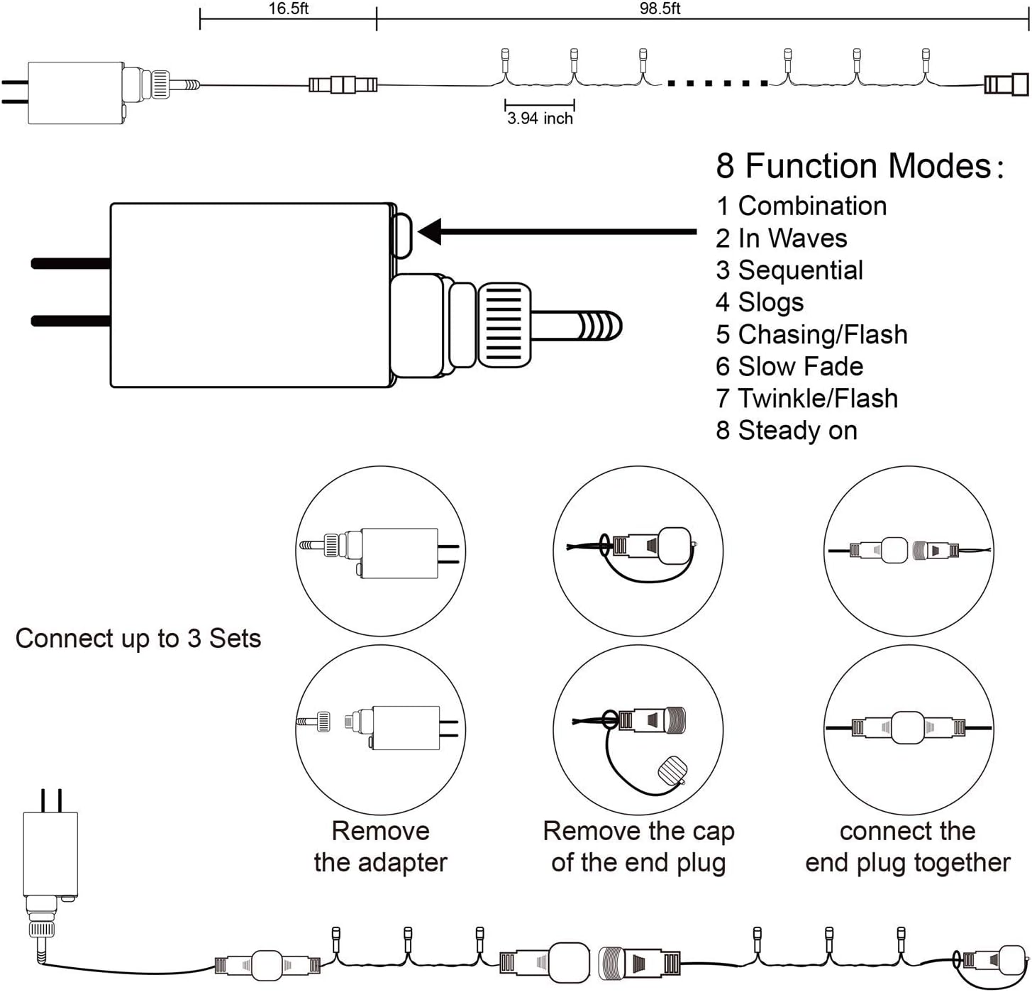 - 8 Lighting Functions: Our Halloween string lights have 8 lighting modes: combination, in waves, sequential, slogs, chasing/flash, slow fade, twinkle/flash, and steady on. Fit different occasions, moods, feelings, holidays, festivals, anniversaries, etc. Pressing the round button on the transformer to change the lighting modes.