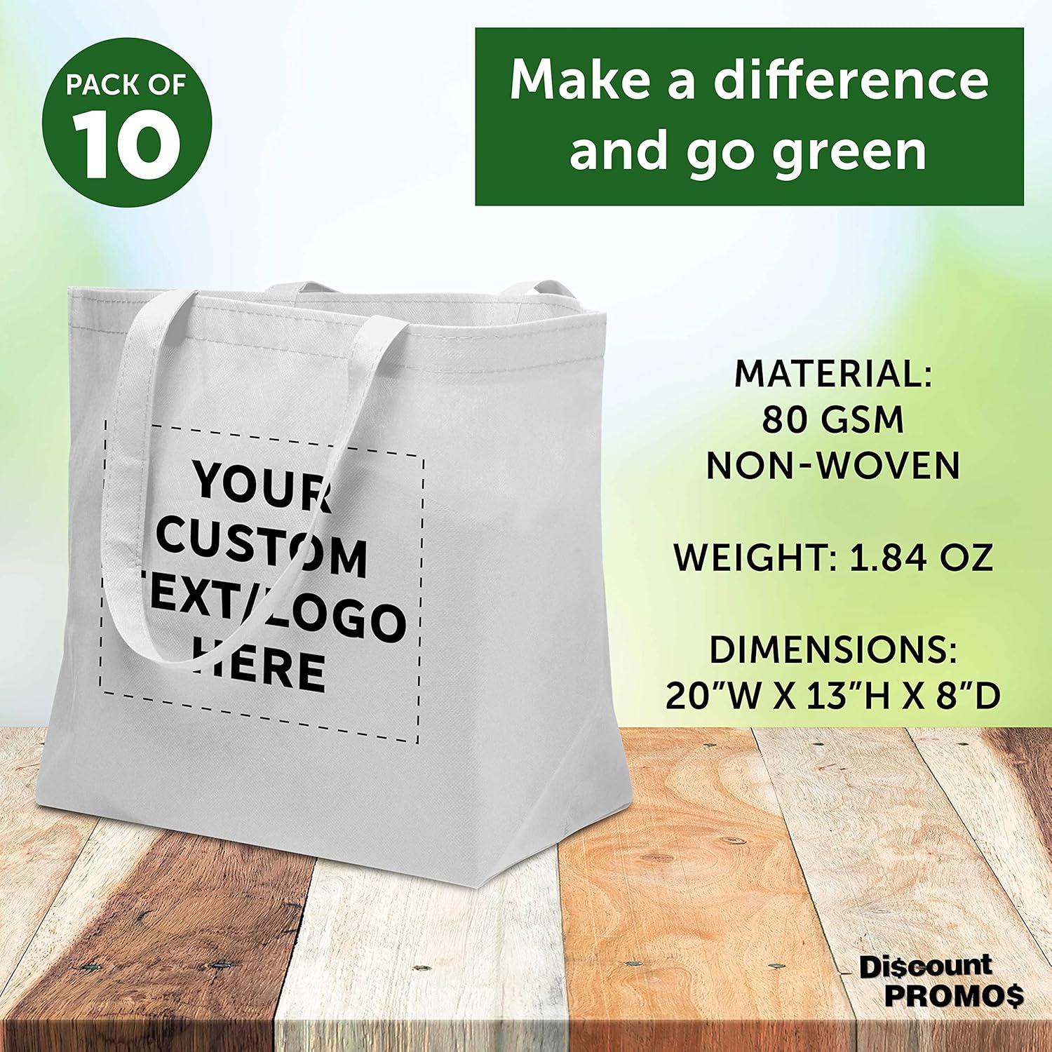 DISCOUNT PROMOS Custom Southern Style Grocery Tote Bags Set of 10 - Personalized Bulk Pack, Reusable Grocery & Shopping Bags - Great for Travel, Carry on Bag, Business Promotions - White - 20"X13"X8"