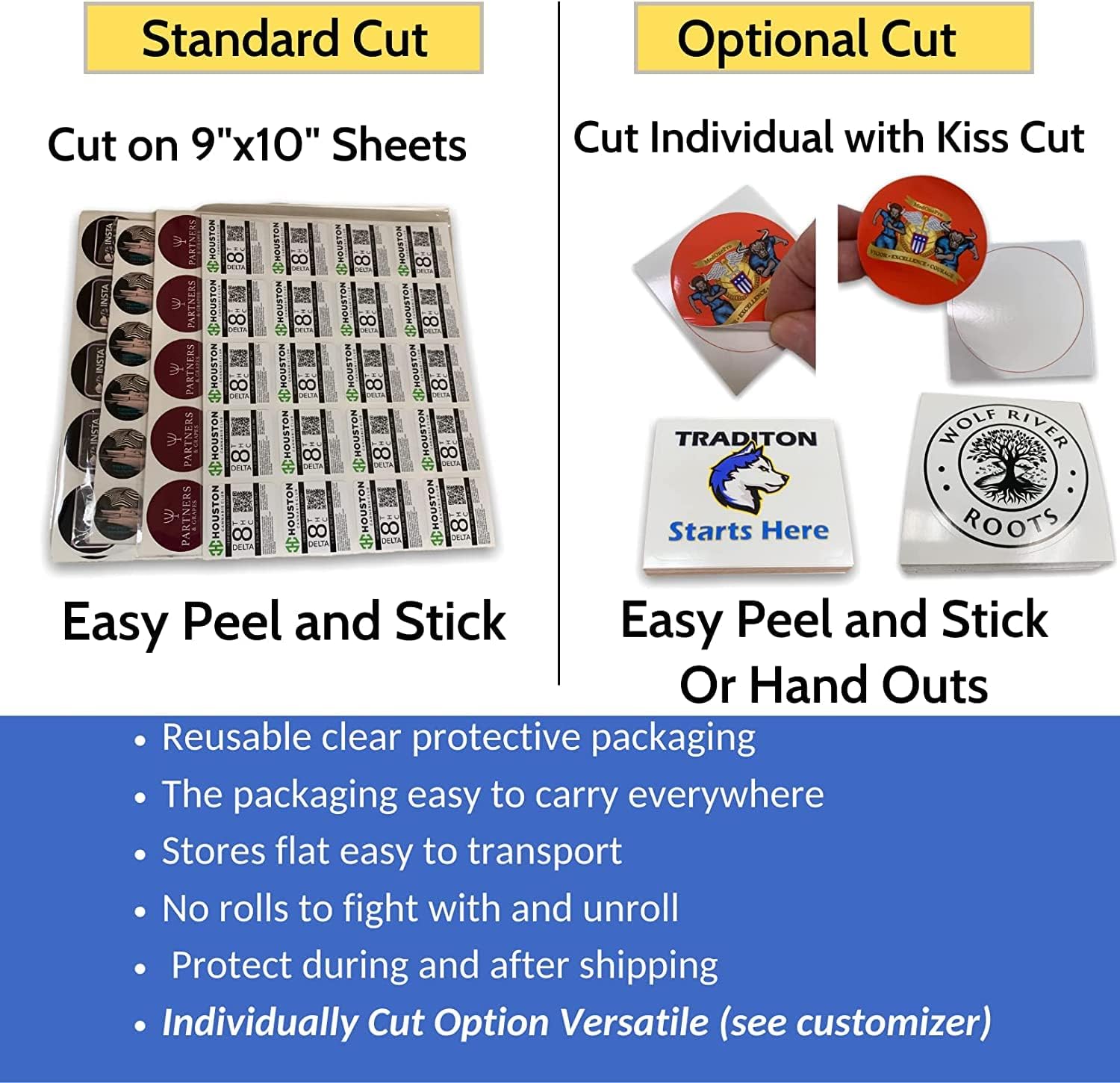 - Uniquely identify business items by adding personalized logos, text or images on the logo stickers and custom decal. Stickers are on 9x11 sheet for easy peel and stick or as a option individually cut