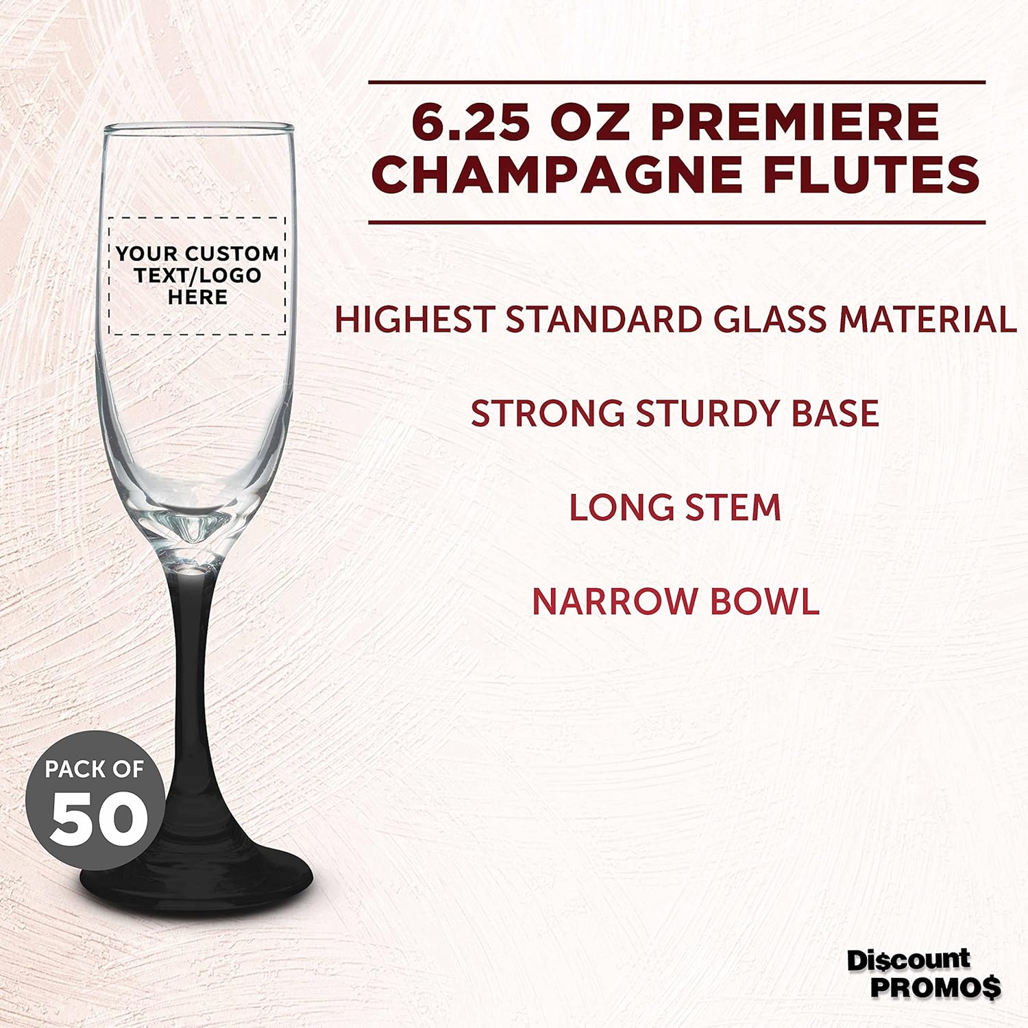 DISCOUNT PROMOS Custom Premiere Champagne Flutes 6.25 oz. Set of 50, Personalized Bulk Pack - Elegant Drinkware for Weddings, Events, & Promotional Gifts - Black
