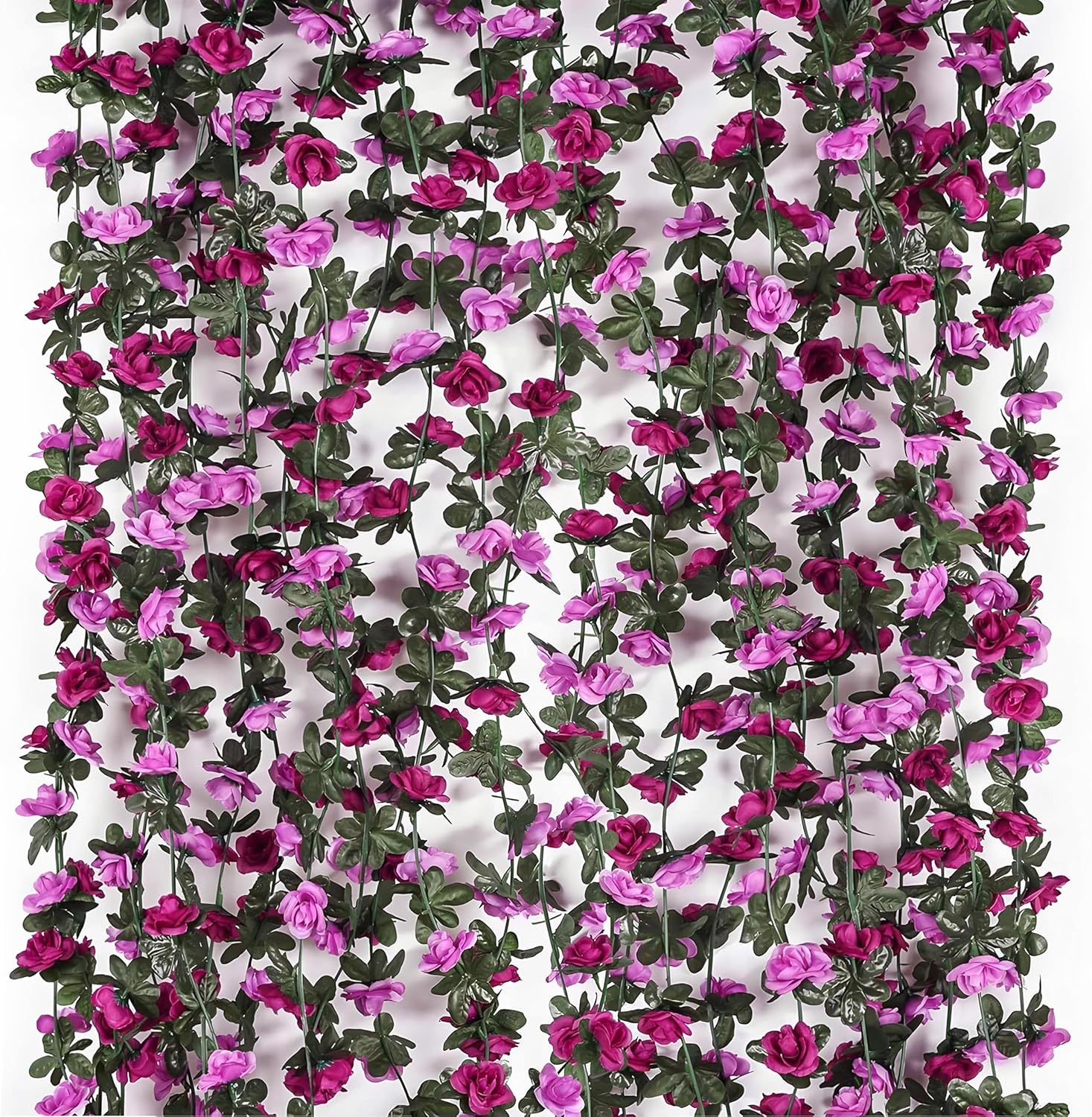 - Size: With total length 74FT, each floral rose garland 8.2 FT Long, flowers 1.6 inches in diameter, each purple flower vine holds about 45 leaves, 45 flowers