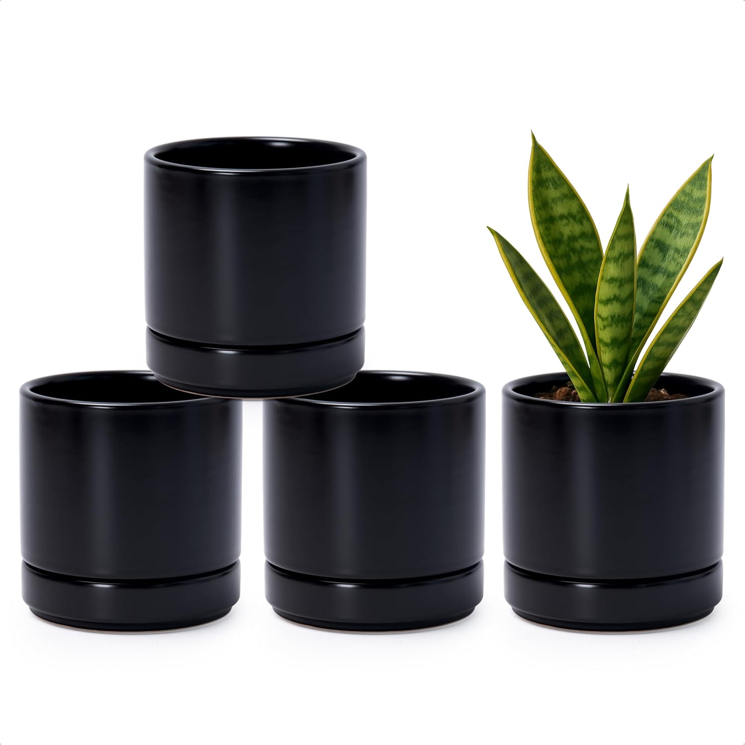 D'vine Dev Set of 4 Small Ceramic Plant Pots, 4.7 Inch Succulent Planter Pot for Plants with Drainage Hole and Saucer, Black, 94-X-B-2