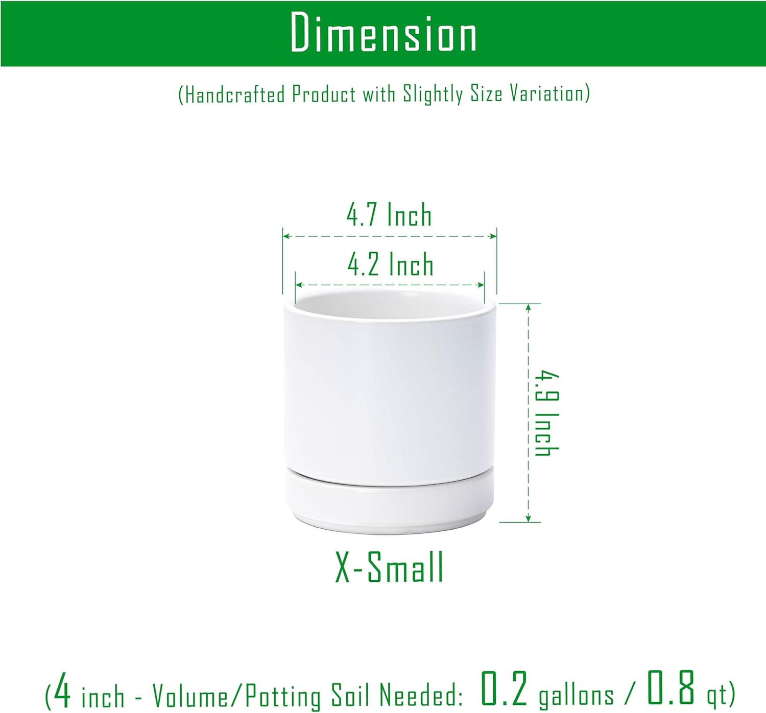 - Set of 4 Small Planter Pots - 4.7" Diameter (4.2" Inner Diameterrr) * 4.9" Height. Volume: 0.2 gallons; Potting Soil Needed 0.8 qt.