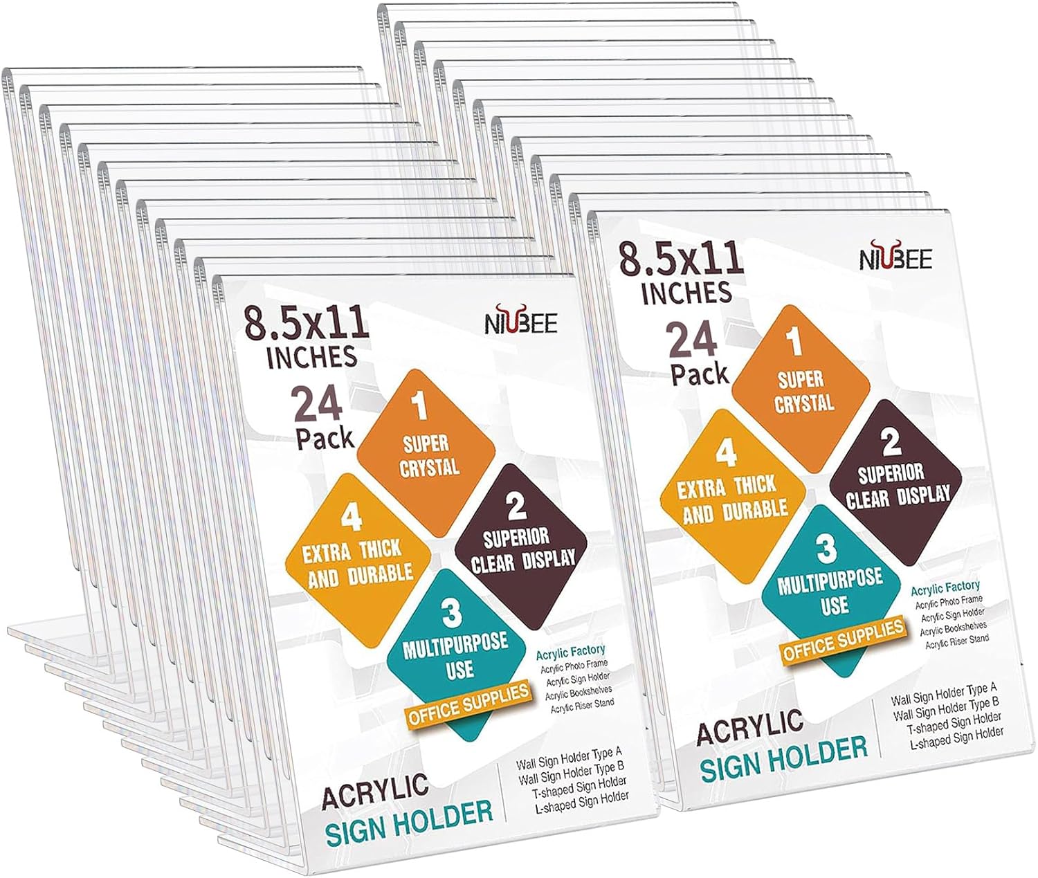 NIUBEE 24 Pack Acrylic Sign Holder 8.5 x 11 Inches Slanted Back, Clear Plastic Sign Holder Paper Display Table Stand for Office, Store, Restaurant