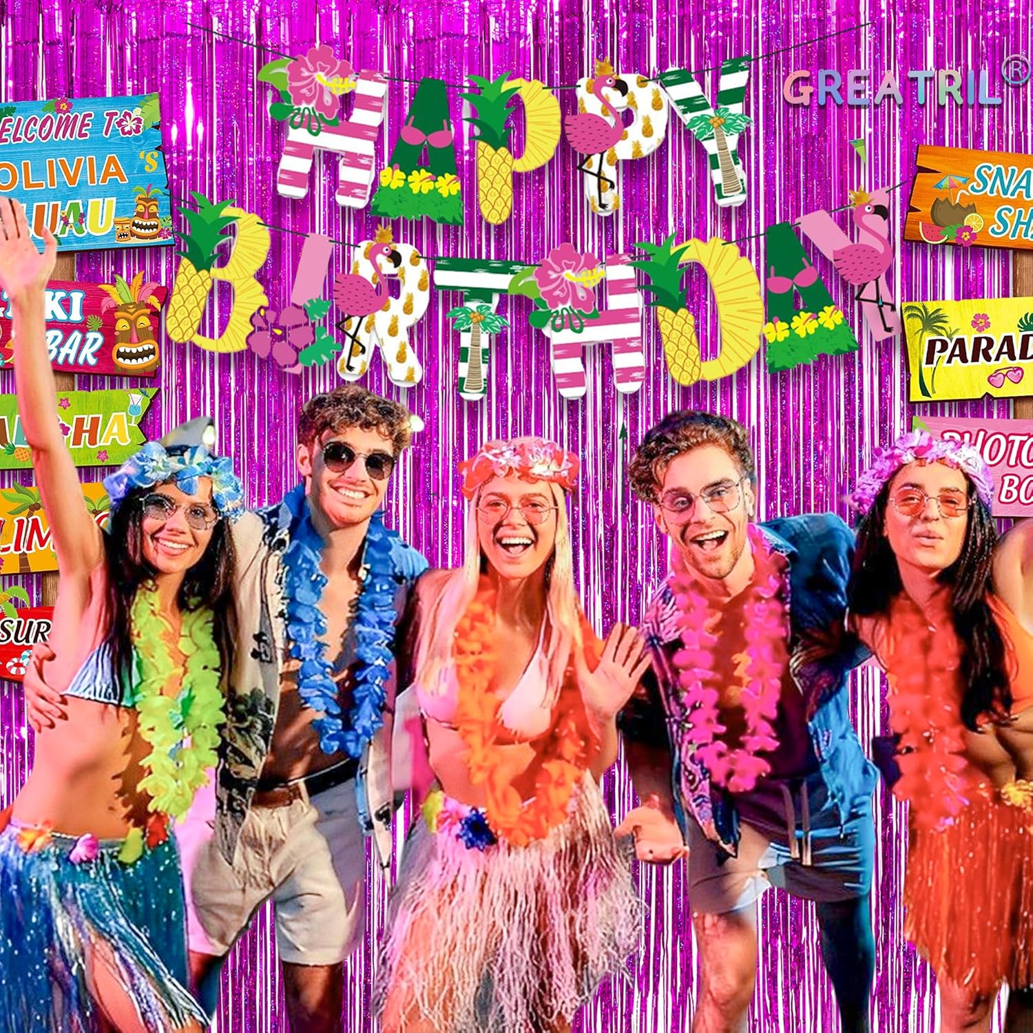 - GREATRIL 2-packs magenta foil fringe curtains. The size of each foil fringe curtain is 8.2 ft x 3.2 ft. You can cut this hot pink tinsel curtain according to your needs.