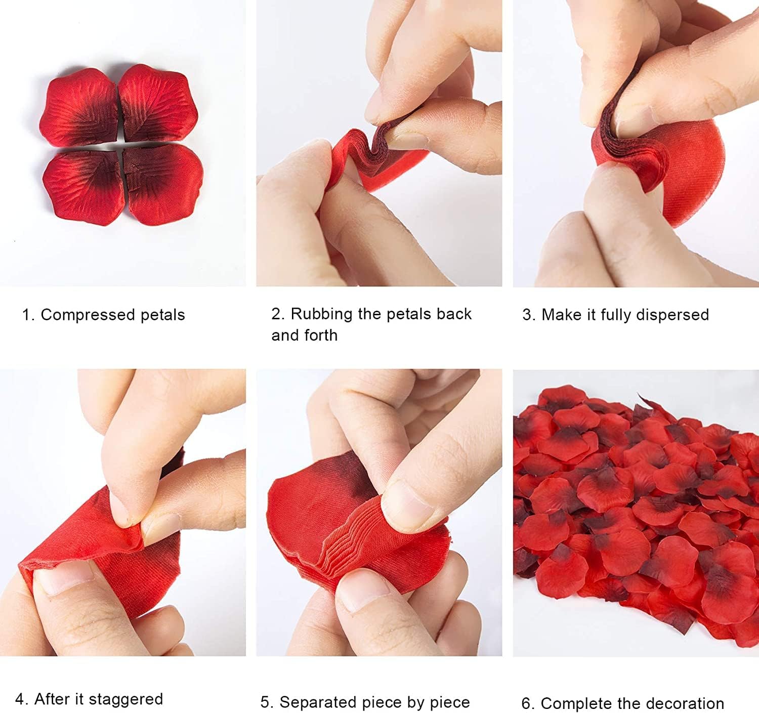 - Please Pay Attention: The silk rose petals arrived stuck together, you need manually separated the petals piece by piece; Hold a clump in your hand and shuffle them off with your thumbs, then the silk flower petals will come apart