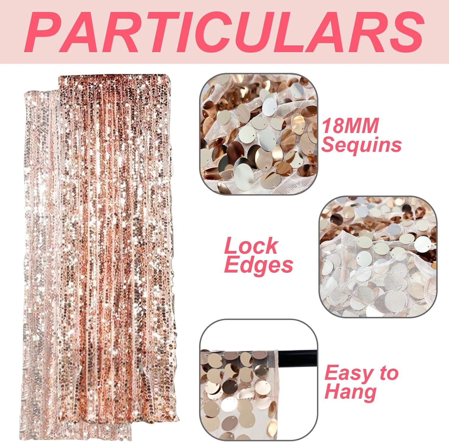 - Sequin Backdrop Curtain Panels: Your package will include 2 sequin photography backdrop curtains. Each rose gold background panel is 4.5FT wide and 9FT high, the whole payette sequin curtain measures 9FT x 9FT.