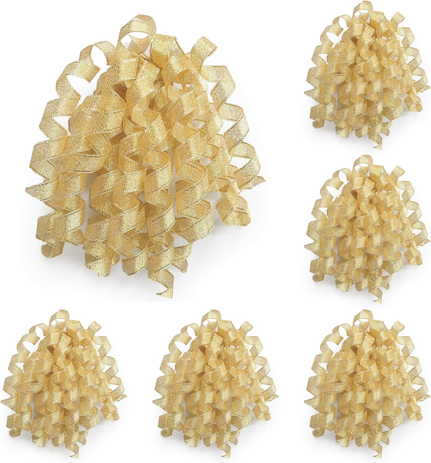 - The gold metallic Curly ribbon bow is 6" Long with self-adhesive tab and There are 6 ribbon gift bows in the package. They are made of high-quality fabric metallic ribbon material, which is durable and has great shape.