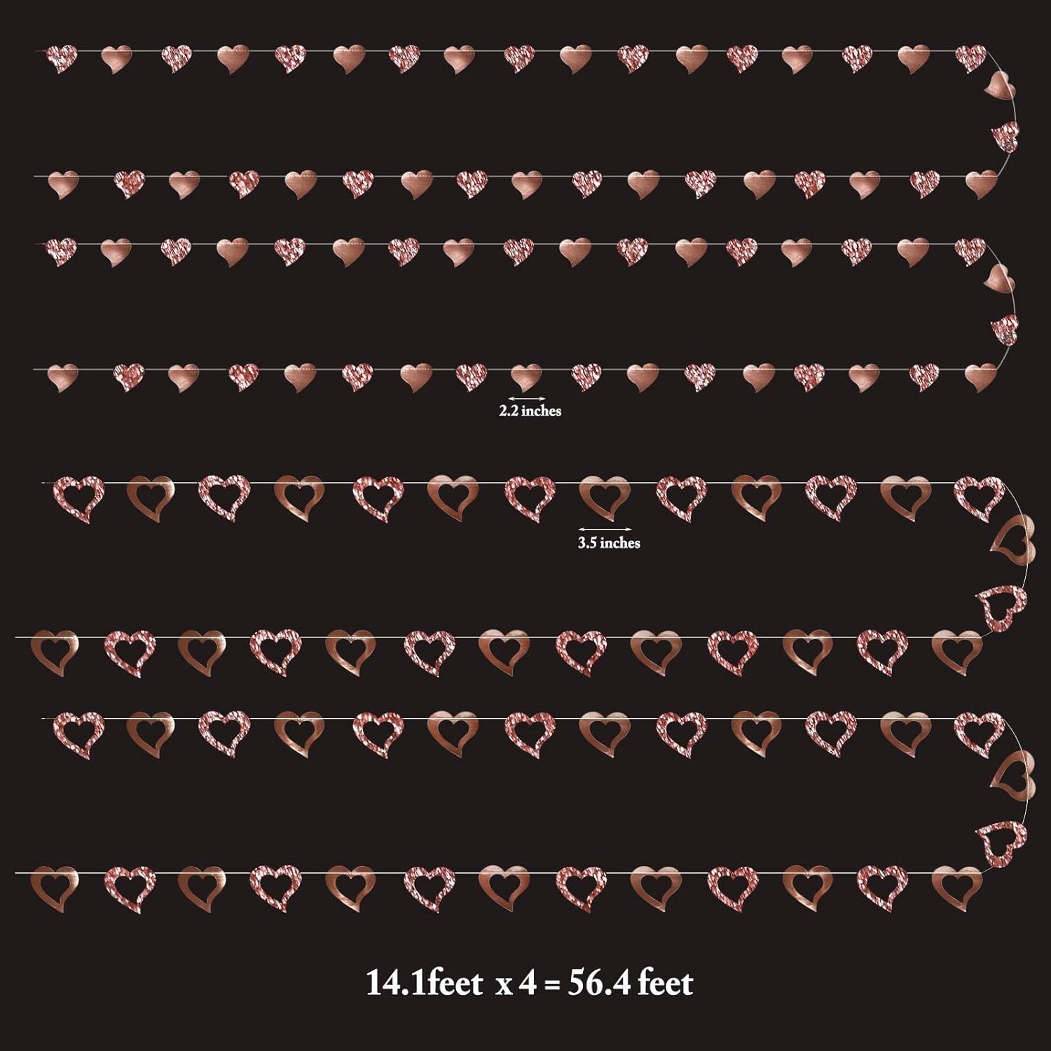 - Package Includes : 4 strings of 14 ft rose gold heart garlands, 2 strings are solid hearts of 2 x 2.2 inches and 2 are hollow-out hearts of 3.2 x 3.5 inches sewn together. Totally 56 ft. The hearts are made of glittering and shining paper.