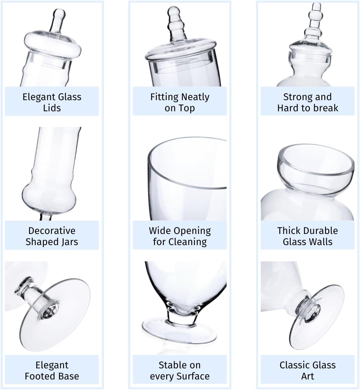 - MODERN ELEGANCE: These glass apothecary jars with lid are perfect for a variety of settings, from bathroom and kitchen storage, to home and venue decoration, garden floral and glass container displays and more. The uses for these decorative glass jars are endless!